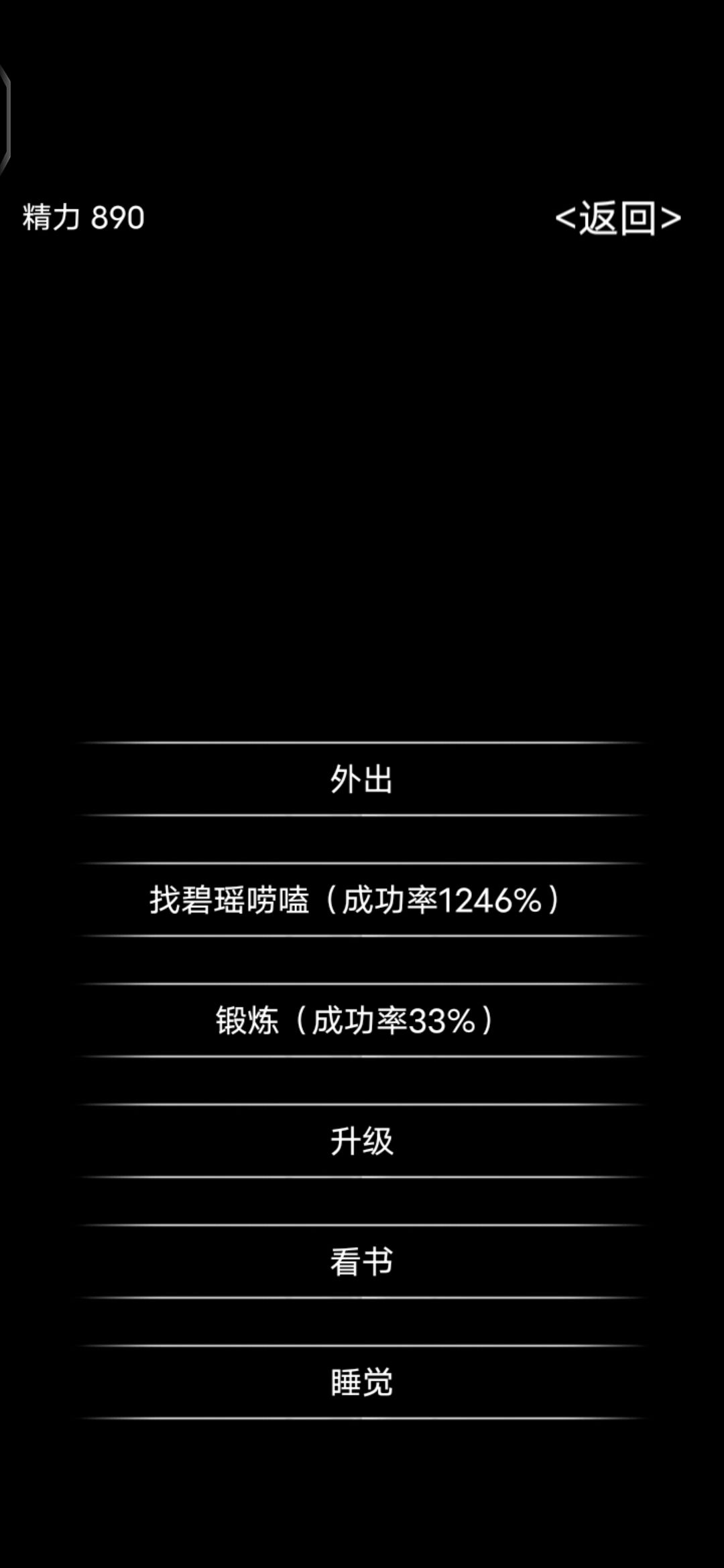 玩了两天,新手难度吧。硬是忍着重复玩了第二遍,第一遍不会玩被赶出省城,第二遍看了些攻略。虽然打死了boss但是并没有什么晓月和那谁的结局,因为亲密度不够吧哈哈哈哈哈。有点遗憾。准备和小碧瑶在一起,但是说得999亲密也不知道能刷到不。 看了看说是要不回家才有结局,再来一遍愣头青开局顺便补时间点。 第七天蛇得45攻击往上加80多血才行。 100米进县城,70攻以上加点防御180↑血第二天的小boss不