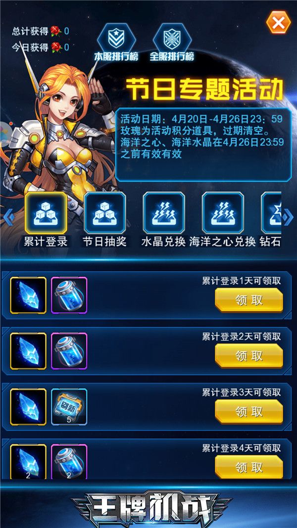 可能许多人还不清楚,每年的4月22日是世界地球日,作为长久以来一直“保护地球”的王牌指挥官,当然要在这个节日庆祝一番!《王牌机战》特此推出地球日大型活动,玩游戏,赢好礼,战力蹭蹭的往上涨!在游戏首页点开“节日活动”就可参与啦。活动将持续到4月26日,在活动期间,玩家参与累计登录、累计充值、节日抽奖等活动即有机会获得节日道具“深海水晶”及“海洋之心”。凭这两样道具在游戏可兑换各类珍稀游戏道具,SS