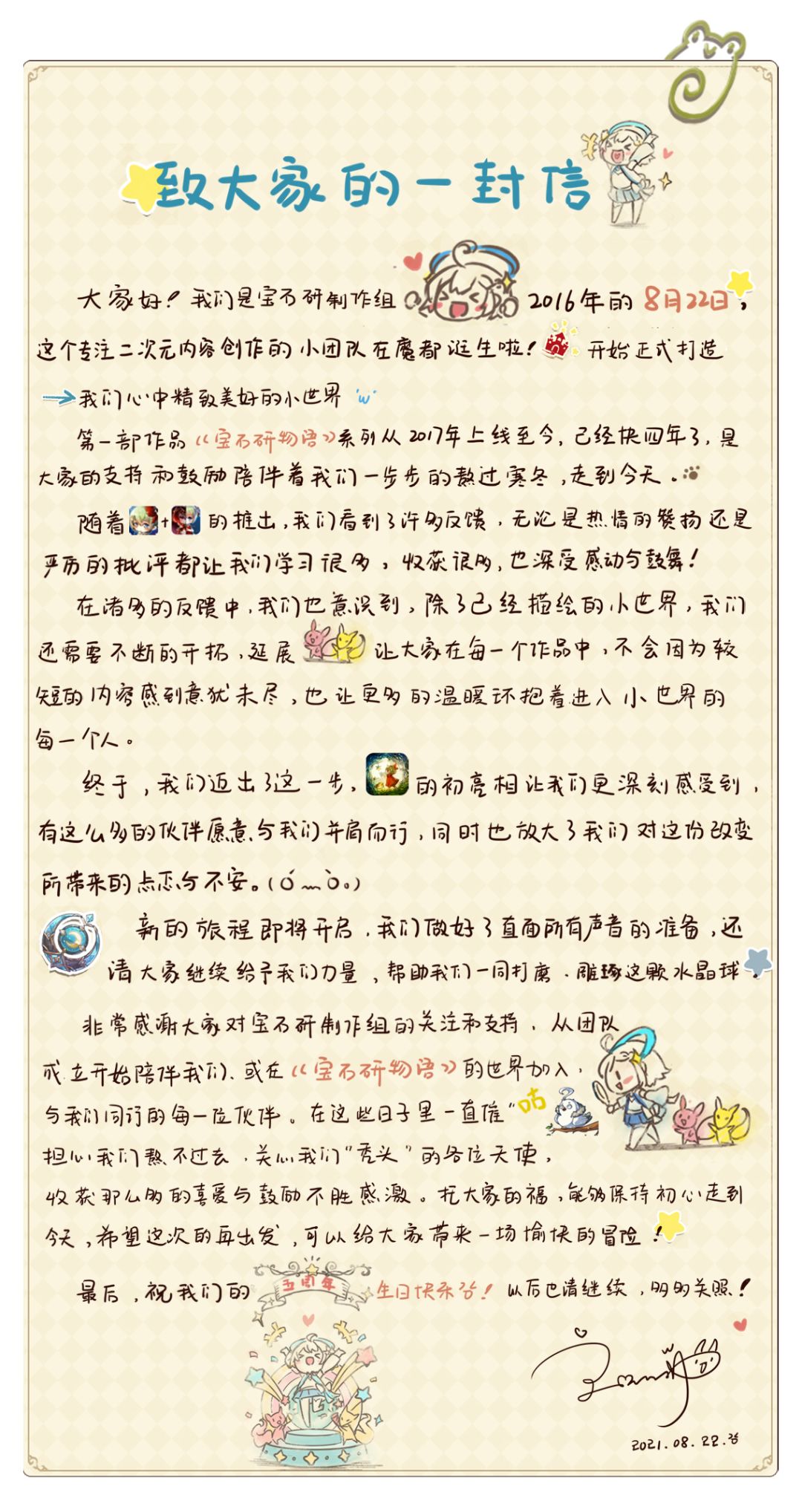 致各位喜爱《宝石研物语》系列的大家: 《宝石研物语》系列自2017年12月21日上线以来,在各位的陪伴与支持下,如今已经走过了六年。在这六年的时间里,大家一起见证了《宝石研物语》系列的成长,在此,制作组要对一直以来给予我们支持与鼓励的大家表示最衷心的感谢,感谢这份相遇,感谢大家和月亮演出团的成员们在这段旅途中留下了许多温暖与感动的瞬间,制作组的每一位小伙伴都会将这些点点滴滴铭记于心。 然而,制