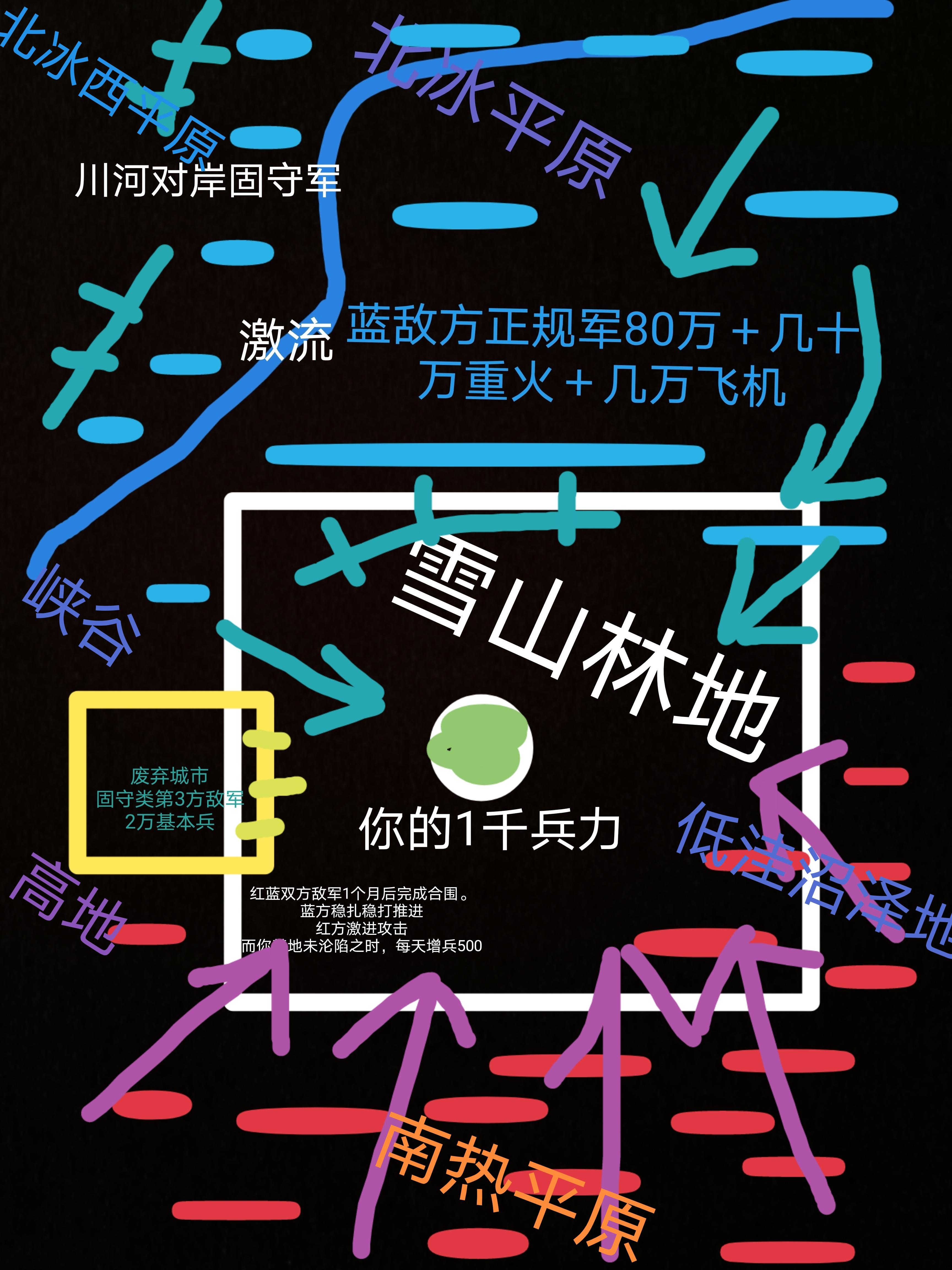 主线任务:1个月合围前,逃脱50%人口就算赢。 你方:基地沦陷前每天增兵500 三方敌军互相对立,但也与你对立。 蓝方保守派,不会远程追击,但会缓慢驻扎推进。 40万驻守激流对岸,40万合围。 几百万兵力红方激进攻势,全面追击。 黄方几万兵力固守建筑,不会动。 背景:战争迷雾状态。你方任何通讯都会被蓝方偷听,你也有50%概率偷听蓝方通讯。 红方,黄方静默。 «开始你的地狱之旅←[点击]
