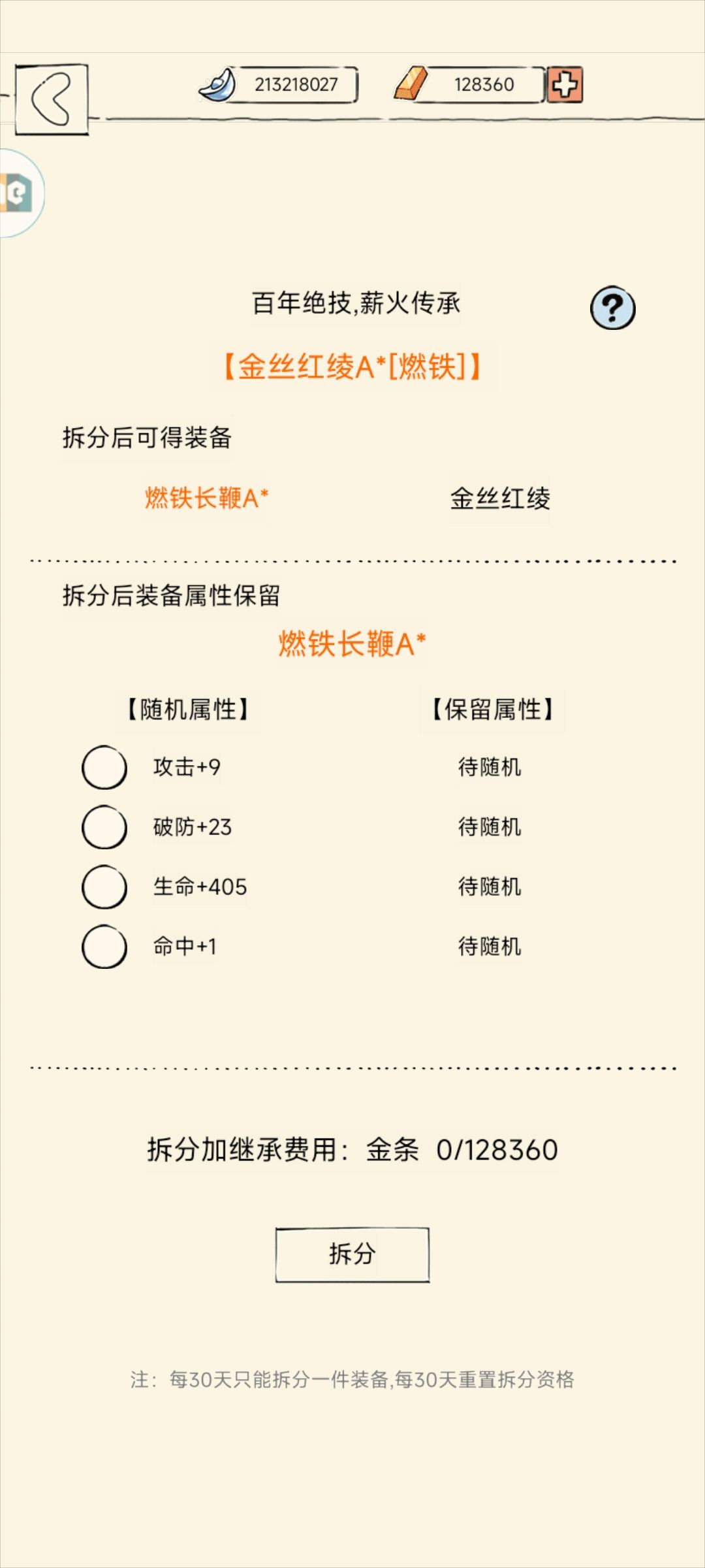 一天一次,下面的属性为比较难出现的属性 武器: 攻击,命中,血量 系数、破甲、穿戴、技能、属性2 因为优先系数和破甲,且出现的种类比较多因此属性2比较难处;现在星纹要求太高,如果出了穿戴-50尽量保留,比如不保留意味着得多升50基础拳进行转换,比较亏 衣服: 防御、生命、闪避、 技能、属性2、穿戴、内力抵抗 比较难出属性2,不吸气的玩家建议不要锁内力抵抗提升属性2出现概率;以前大家都推荐锁住内力抵