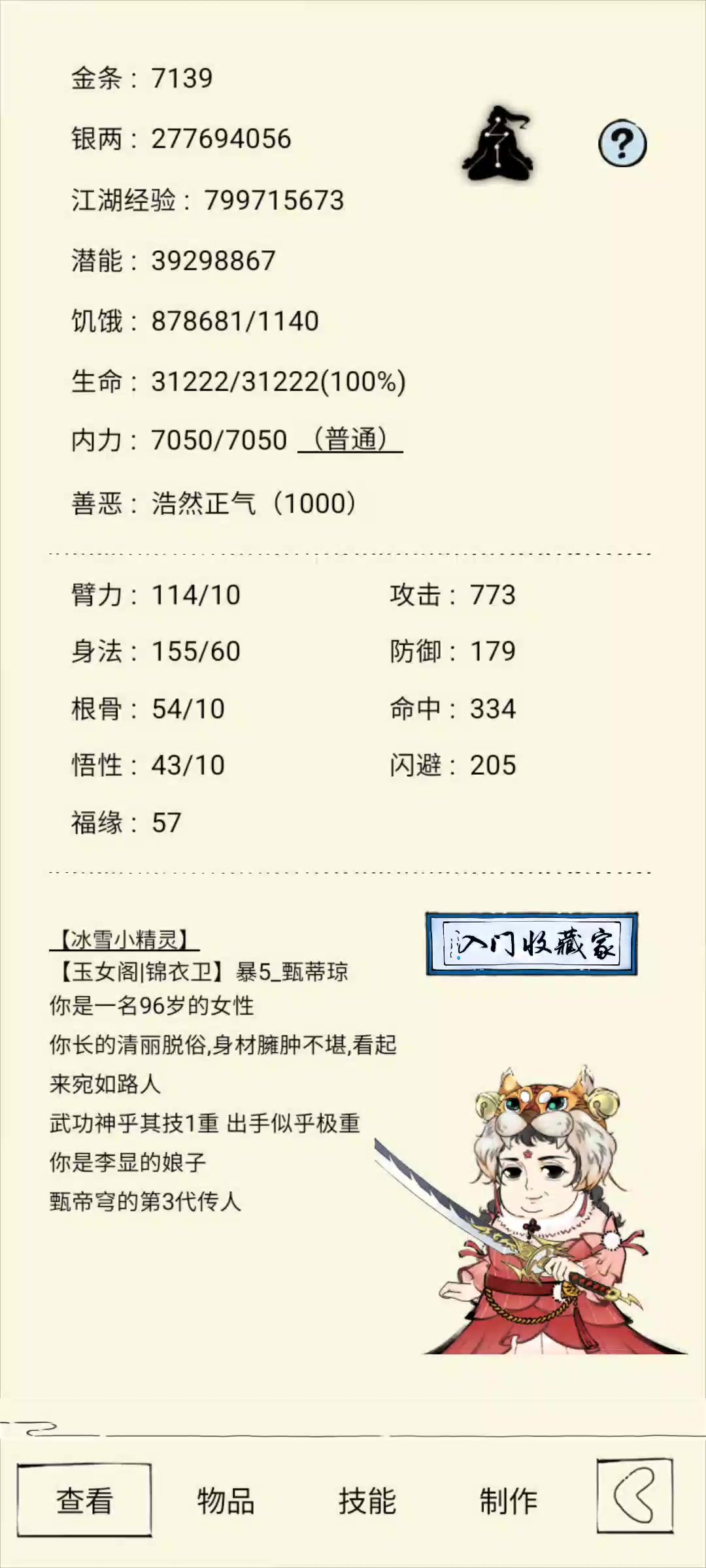 非内功系数19,内功用不匹配双手,300太白,1级94,300混元5.5系,500十象。都是神器套。真武四维+10,铲子+10%最终伤害,针+4暗器系数 刀套攻击1310臂力224 剑套攻击676身法215悟性216 鞭套攻击626身法213 棍套攻击626根骨206 拳套攻击626根骨206 基本轻内读书600,最高进阶内500,二境11020内107破防。 模拟打方然,30回合总伤害。普攻取中