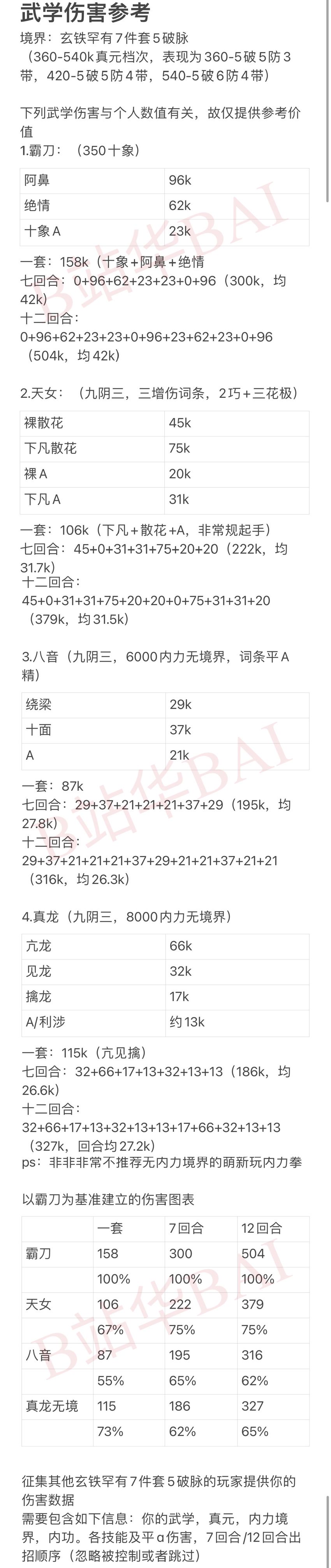 顺便 征集一下其他武学的数据。 打地狱守门员 平a取平均伤害 最好是和图中练度接近的 目前最希望能得到的数据:真龙、飞雪、八音、狗棍、霸王 内力武学请提供境界和内力。领悟请提供词条等级 建议带增伤内功测试,例如八音不能带十象和太白但能带九阴。飞雪可以带太白