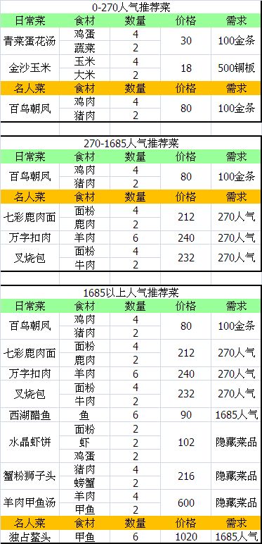 以下是经过整理性价比较高的白嫖/微氪菜谱攻略,各种食材都尽量不浪费。 前期注意攒5000铜板170人气开猎场。能不花的铜币尽量不要花。