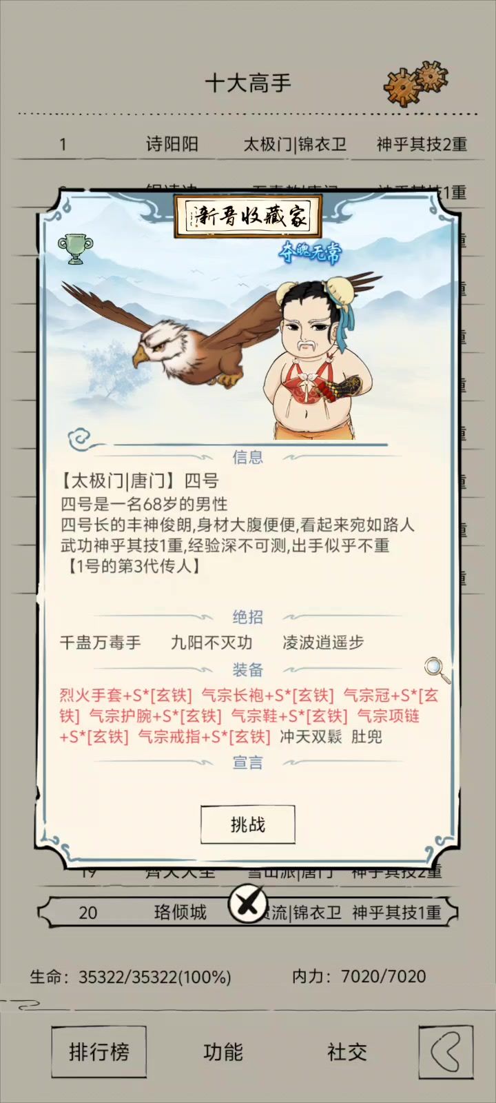 推荐分为下水道,普通,强大,超限 太极:超限。 武学有两仪和江湖太极棍八卦(虽然是江湖武学,但是强度较为吃太极武学)强武领悟,悟性发育,可直接带走或者下轮轻松拿到,无性别限制,21四轮乏力(前三轮天王强度),八卦吃臂力(后期也是大爹,最强直伤武学,但发育时间过长) 伊贺:普通。 武学三刀和八门不错一点的领悟武学,顶配八门强度不错,但也只是不错了,无性别限制,不能发育加点,前期不是很好带走,不出师速
