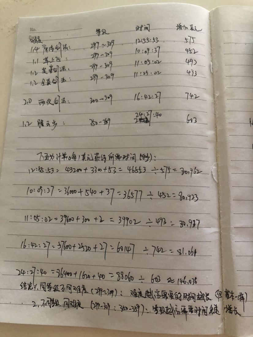 轮回后就一直躺床,真元获取速度一直很困扰,今天看到了一个真元帖子,突然萌发了计算一下在现有条件下怎么更加快速获取真元。下面是我根据自己现在躺床的武学等级计算出来的。 总结了一下: 1.同等级不同难度(以299-309为例):同等级不同难度的武学需要的时间基本一样,总体上武学难度越高,获得真元时间略微增加。 2.不同等级同难度(以全真剑法299-309和腾云步350-359为例,都是1.2难度):同