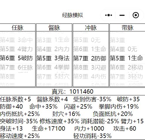 一、经脉及真元的意义 经脉属性是轮回后附加的属性,经脉属性的高低直接决定了轮回后的战力上限。总体而言,经脉属性随着经脉等级的提升而增加,但同时也会消耗更高的真元。而真元高低则主要取决于一世修炼的武学等级和轻功等级,与内功等级无关。由于轮回会损失一半潜能,因此高真元往往是堆高等级武学以牺牲潜能为代价换取的。一世的真元规划主要取决于门派、轮回武学类型、愿意牺牲的潜能以及江湖格局共同决定的,因此往往因人
