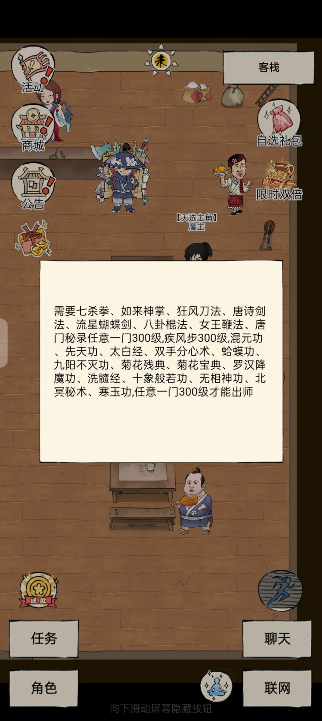 突破条件: ①基础轻,基础内,其中一个基础刀、剑、拳、棍、鞭、暗器,到达600级; ②内力达到150%比例; ③真元100w以上; ④无遗漏属性点(出个激活血脉,补充属性点的NPC) 突破奖励: ①开放700级先天境界,三项基础达到699级后在神秘人的帮助下准备材料,突破先天境界; ②达到先天境界后,先天以下所有潜能消耗减少20%(读书除外),武功修炼速度增加100%; ③当入先天之时,感知到一灵