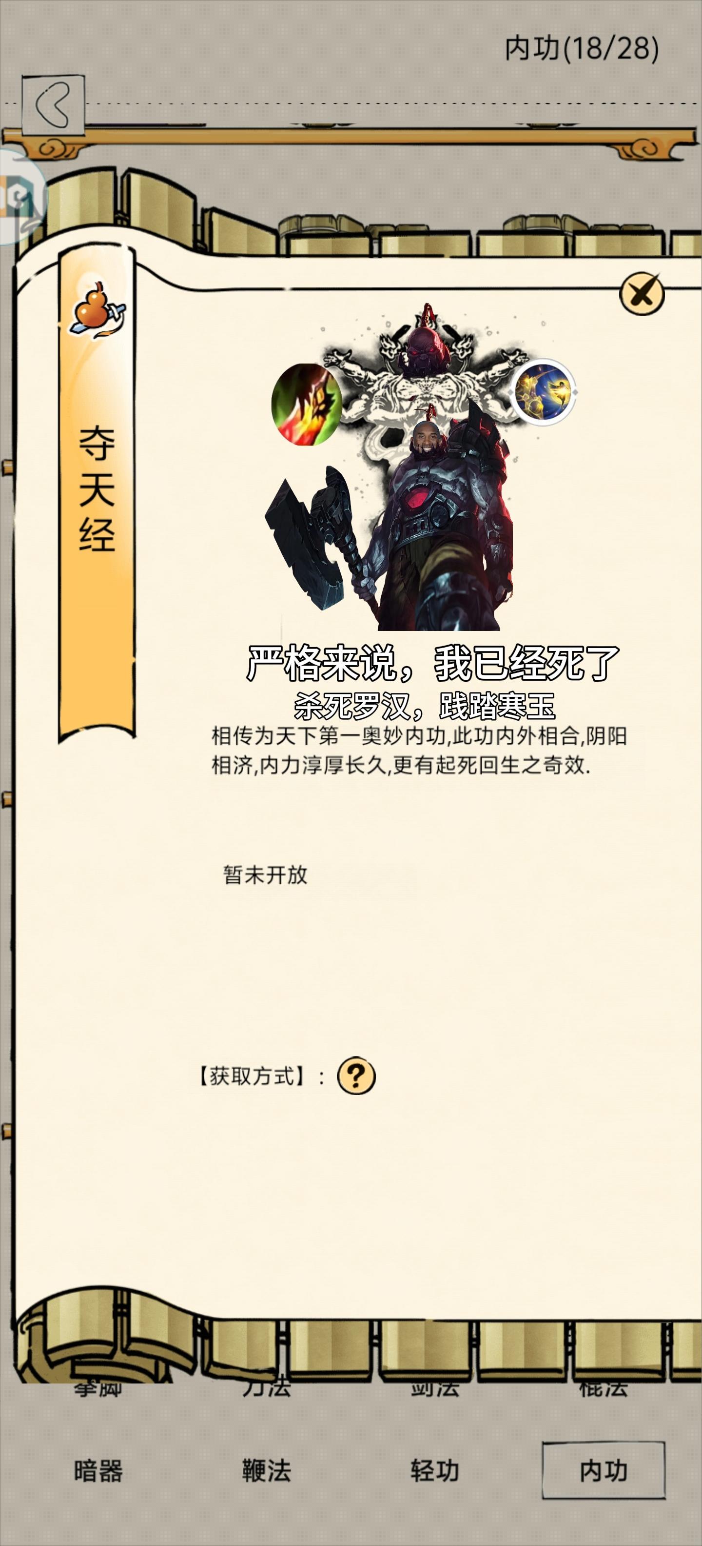 新增羊皮卷绝学【天照经】 武学定位: 类型:内功 级别:羊皮卷绝学 武学特性: 1)【起死】死而复生 生命耗尽时回复部分生命内力; 获得一回合无敌并增强吸气效果; 自动释放绝招【神照自生】(无视冷却内力、不占回合) 每场战斗生效一次,复活次数随内力境界增加,冷却5回合,逐渐降低回复效果 2)【回生】提高生命内力上限; 每回合回复生命内力内伤; 三回合不受伤害时增强回复并重置【起死】冷却#游戏讨论