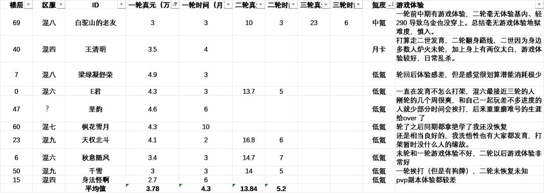 一、关于小蓝、小红和小紫的数据总结 本人斥资5张月卡,在https://www.taptap.com/topic/19065947一帖中征集了71个玩家各轮回真元的选择及游戏体验,加上我了解的混六29位玩家的真元规划及游戏体验,一共正好100个有效数据,梳理后集中展示如下: 1、小红(一轮真元<6万) ①小红玩家俗称“速轮流”,单炉火不修炼其他武学马上轮回,因此显著特点是一轮真元低但轮回进度领先。