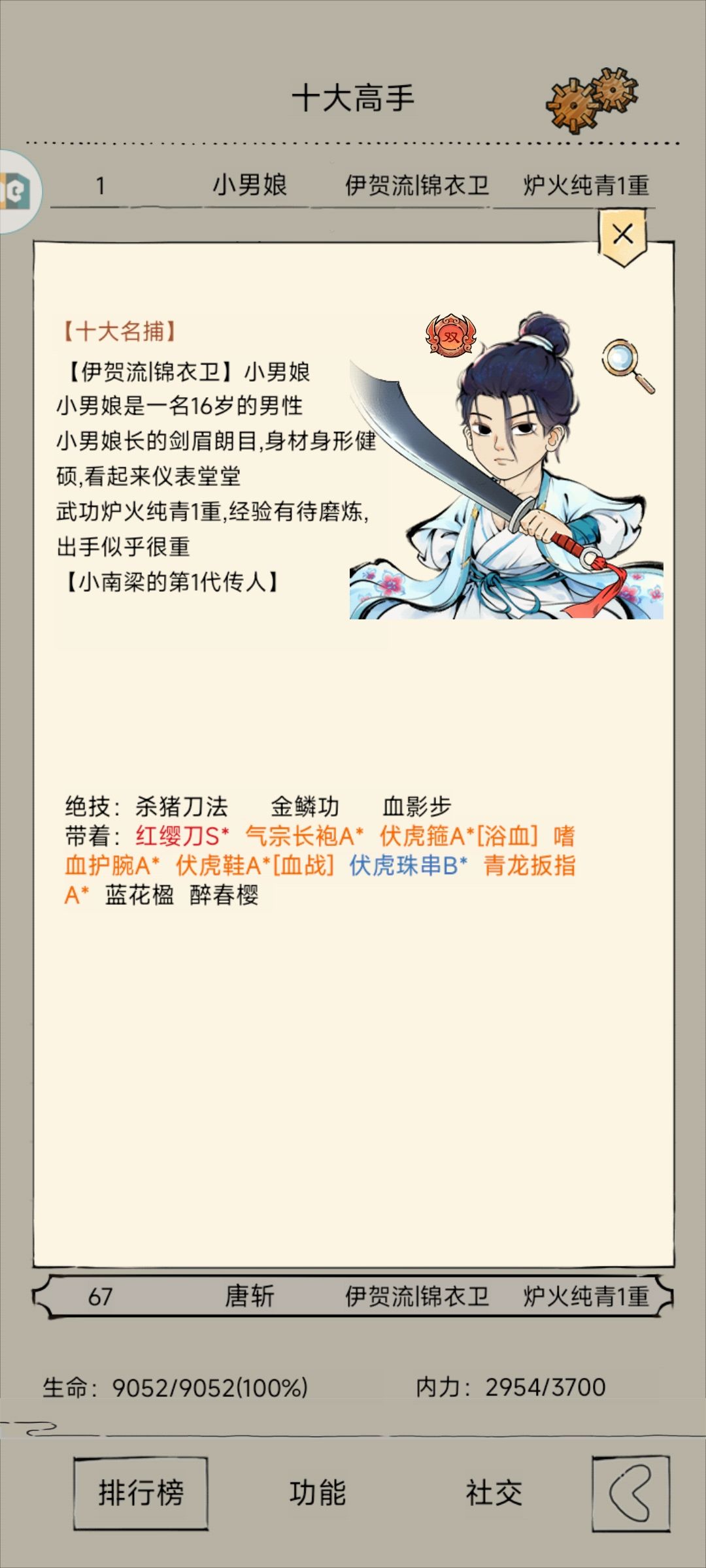 必带口诀: 生门:减少八门开CD 龙凯:强化天象 选带口诀: 休门:八门开期间减少内耗 景门:八门开期间身法提高 武学简介: 原本的伊贺体术只是一门下水道门派武学,虽然有仍复活机制,但长达10回合CD的八门开和天象同归于尽式打法,让这个武学基本上没有任何强度,而武学领悟,正是解决了伊贺体术最大的两个缺陷,使其真正拥有了机制能发挥之处。独特的爆发机制和拥有复活能力的保障,令其拥有了相当不错的战斗能力