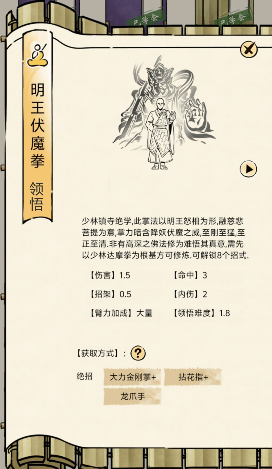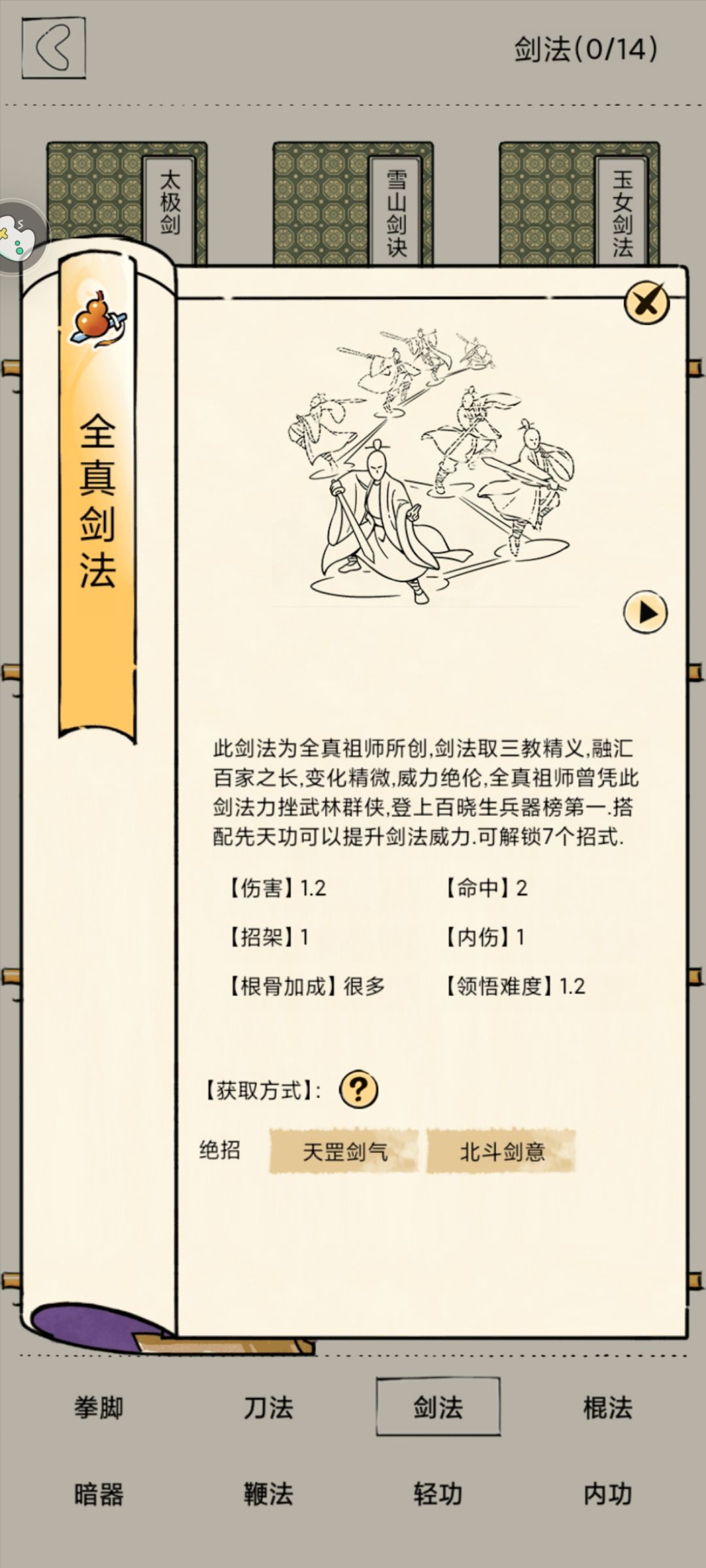 太极拳 简介:相传为张三丰所创,是以柔克刚的绝学用意不用力,绵绵不绝,以守为主随着进境提高,威力越来越大可解锁10个招式。 获取方法:太极门派武学。 学习条件: 门派:太极门 绝招详解: 【挤字诀】:造成极少伤害,并给敌方添加负面状态“挤字诀”,下回攻击必定被我方闪避。(①内力低于对手有几率被反震,使自身呆若木鸡无法行动。②可被狮子吼清除。③挤字决命中了也会被一些决招命中,比如珠联合壁