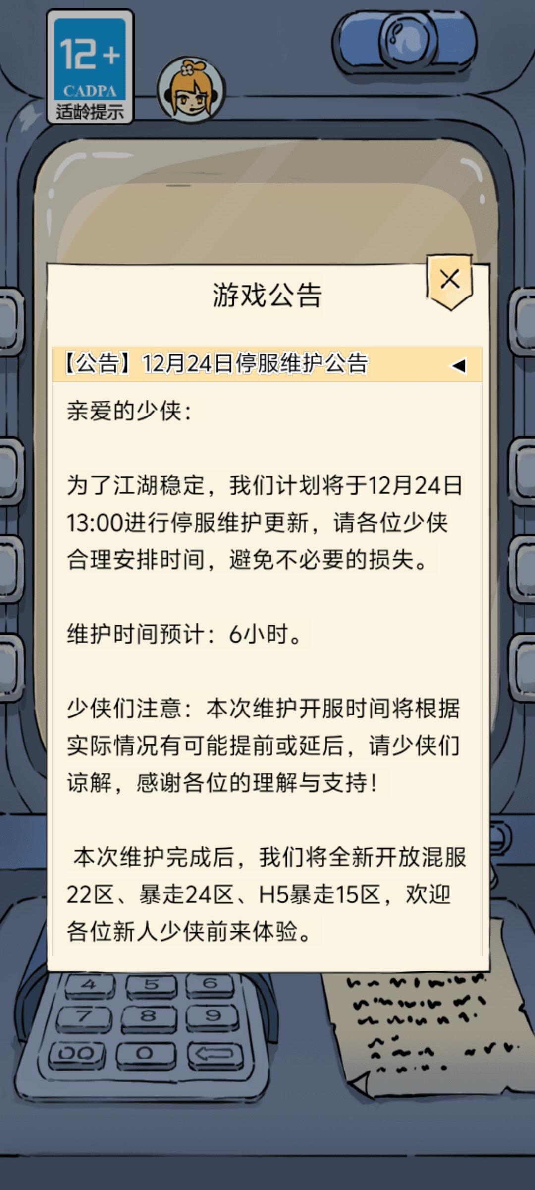 亲爱的少侠: 为了江湖稳定,我们计划将于12月24日13:00进行停服维护更新,请各位少侠合理安排时间,避免不必要的损失。 维护时间预计:6小时。 少侠们注意:本次维护开服时间将根据实际情况有可能提前或延后,请少侠们谅解,感谢各位的理解与支持! 本次维护完成后,我们将全新开放混服22区、暴走24区、H5暴走15区,欢迎各位新人少侠前来体验。 《暴走英雄坛》运营团队(*小游戏区活动公告
