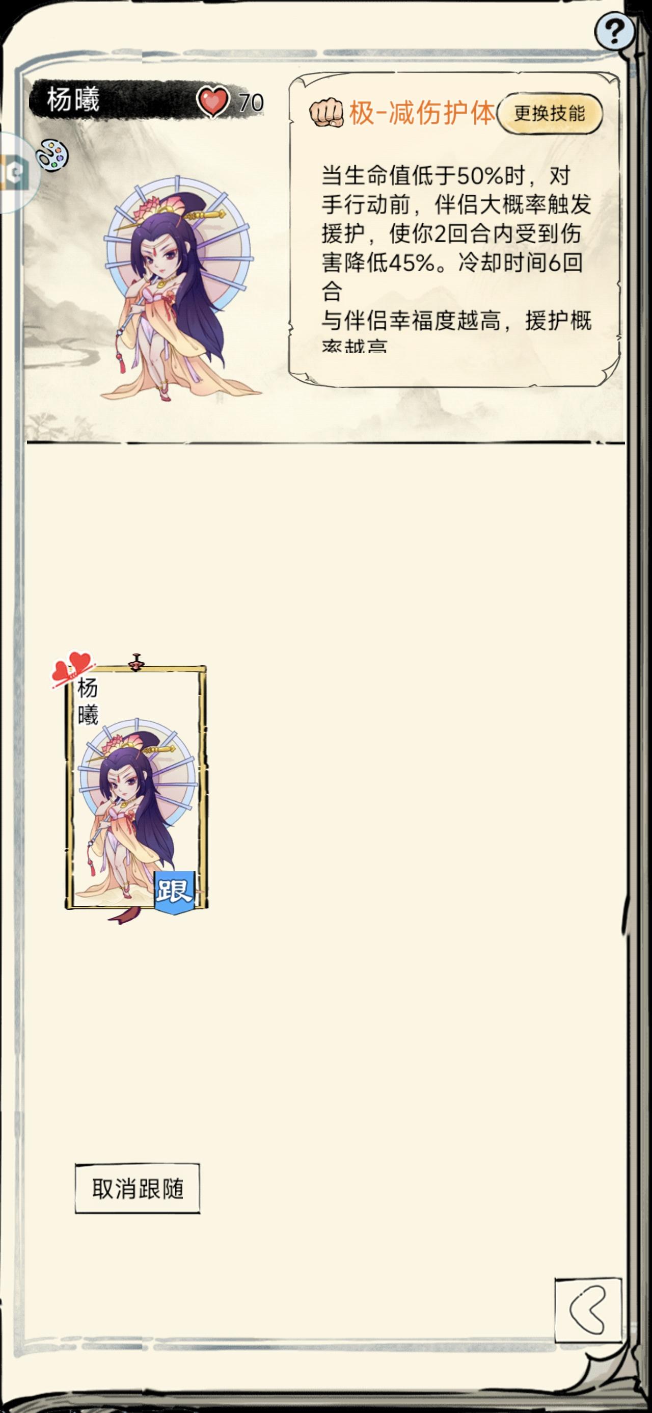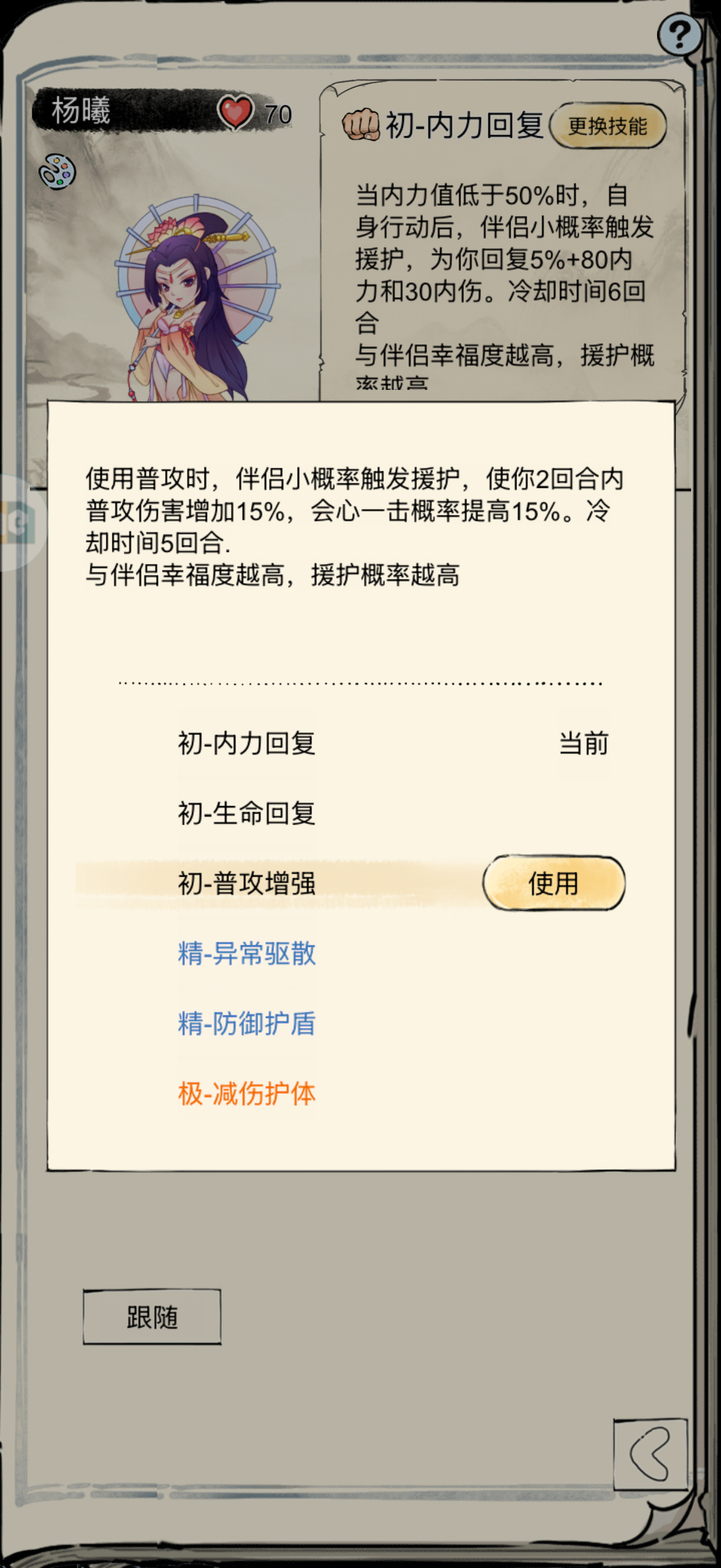 伴侣技能的选择1.普攻增强提升普攻伤害2回合,冷却5回合(提升伤害,适合普攻输出武学,pve不多评价)2.内力回复内力低于50%触发,10000内来算,大概500多,如果稳定触发7回合回一次,一回合几十点吧,幽默(可有可无的回内,而且技能是低于50%触发,对单罗汉也许有一点续航补强)3.生命回复生命低于65%,回复9%生命,冷却5回合(目前觉得潜力最大的技能,5回合的冷却