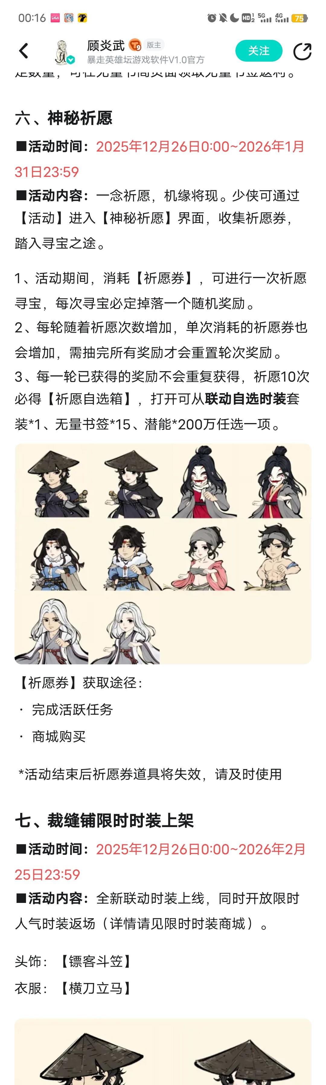 首先维护时间为12月24日13:00预计6个小时; 那么本期活动分别为:1、镖人联动:限时剧情、联动时装和联动武器外观,可能有活动副本?敬请期待...... 持续时间:2025年12月26日0点至2026年2月25日23点59分。2、签到时装:活动期间内签到10天可获取时装如下;持续时间:2025年12月25日0点至2026年1月13日23点59分。3、大地图(迷失的世界)游历山河活动