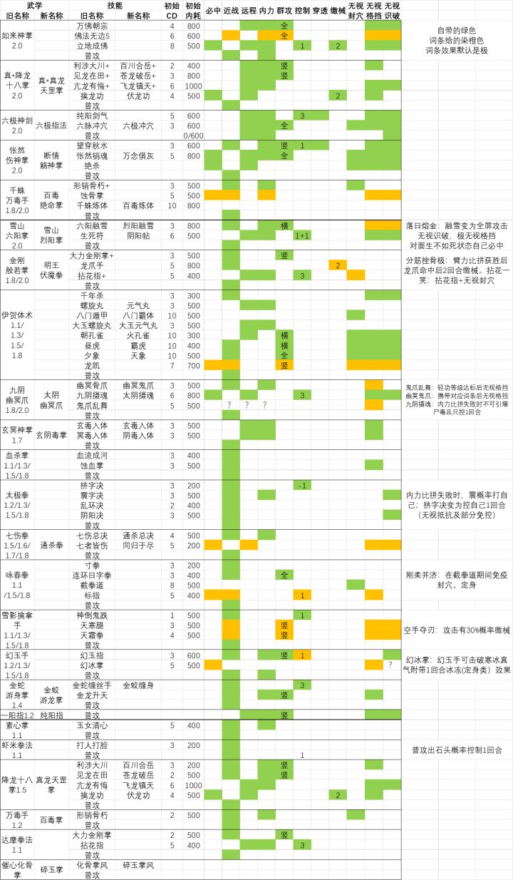正在补充和修改。缺失项已打问号,空白不代表没有,可能是测错了或待测绿色是自有特性,橙色是词条带来的效果&词条给的新技能词条效果默认为极
