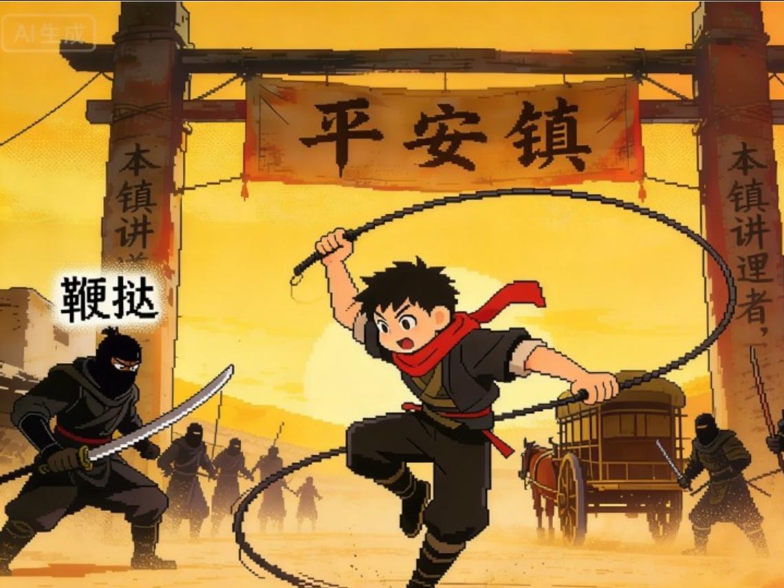 漠北的风卷着沙砾,刀马护着藏有叛国文书的镖车走在官道上,这趟镖是他给故人的最后承诺,也是为了和小七能安稳度日。 风里突然混进铁器的冷意,刀马手按刀柄,只见枯树后窜出个扎红围巾的少年——从平安镇出来闯荡的暴走主角哥,他甩着软鞭喊着要劫镖,嗓门盖过了风声。 刀马正要开口,镖车车轮被透骨钉射中,一群黑衣蒙面人从沙丘后涌出,逼刀马交出文书。暴走主角哥愣了愣,反倒瞪着黑衣人喊“先来后到”,纵身一脚踹
