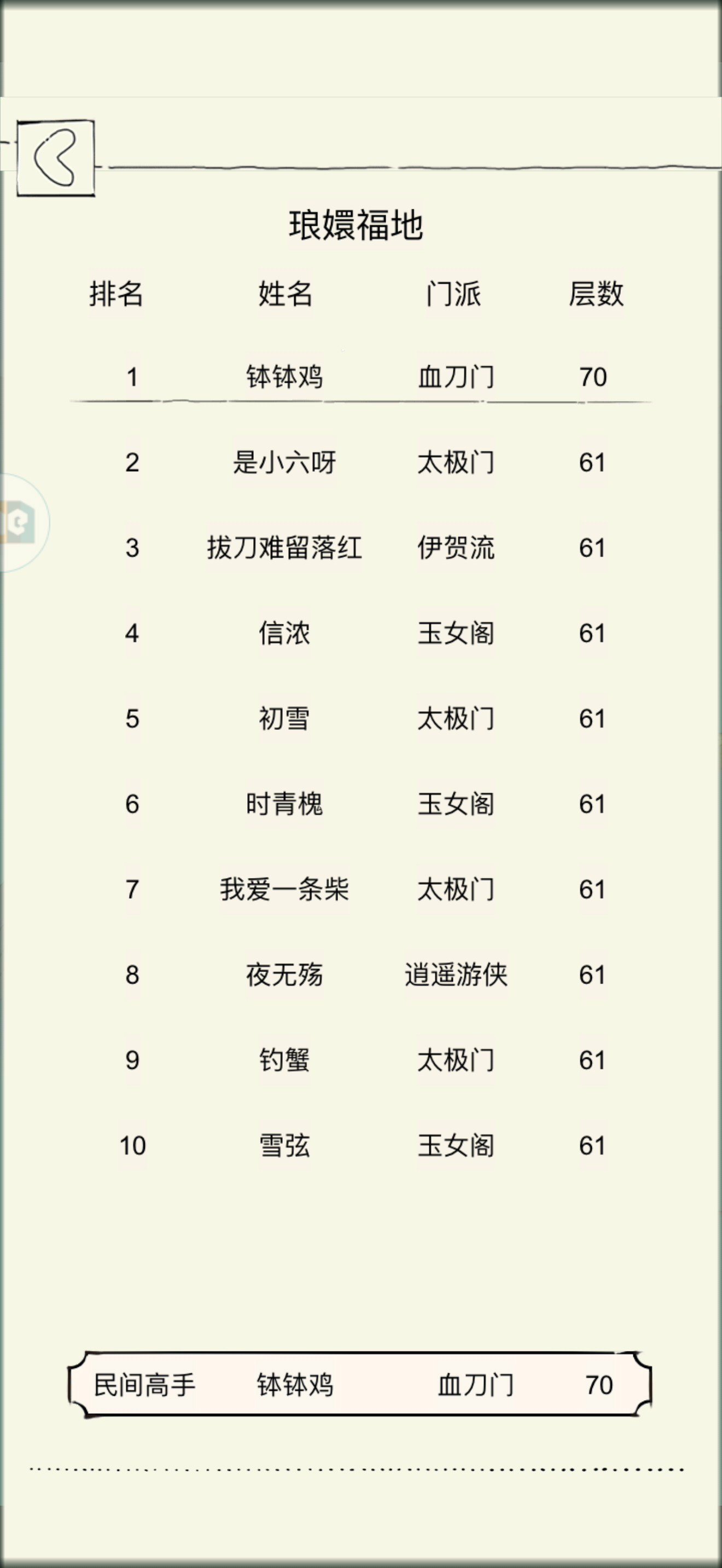 坏消息:遇到东方不败了好消息:70层了不用打 总结一下首次冲福地的方法,那就是一边打一边查攻略一边在群里疯狂问大佬。 运气不错,60到69层没出东方,就遇到了几次很讨厌的诡术妖僧,我用药和毒硬打过的。还遇到了一次雄霸,绝品ssd 就用了2次,一个就是在这里用的。也遇到了一次伊风雷,也是用绝品丹过的。 还有遇到了几次斧头帮,但是对于血刀来说,反击太爽了几刀一个,不