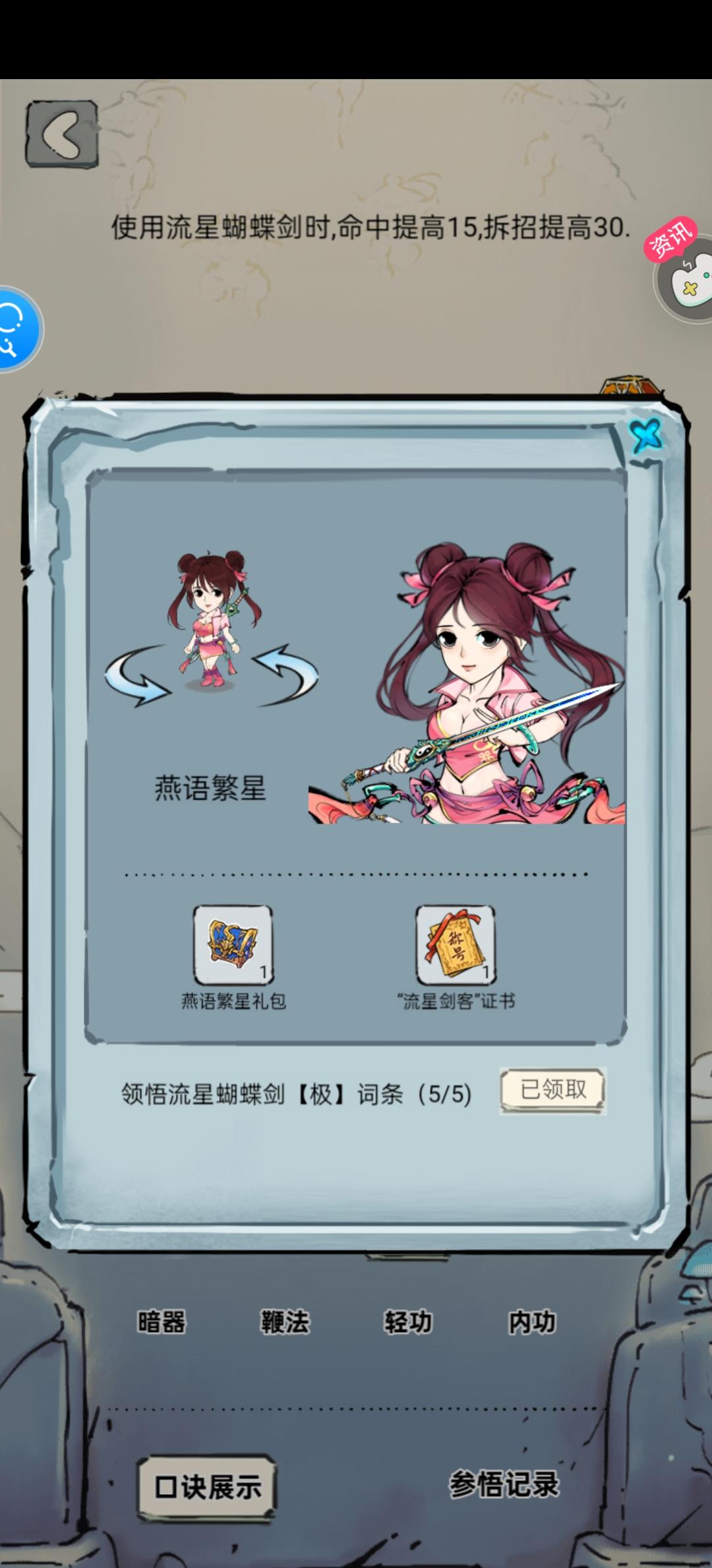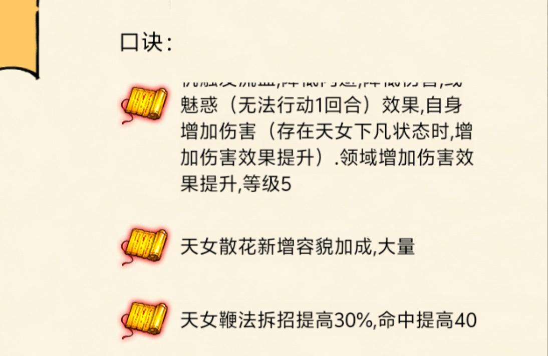口诀全极,但无限闪避流需要三花,不能用飞花蝶舞口诀。 常规技能输出为:天女下凡+天女散花+平a+三花聚顶+平a+天女散花+天女下凡+平a+平a+天女散花 对于某些武学如两仪,开局要么放必中的阴阳候列要么开剑阵,没必要一来就放天女下凡,对于霸十,开局会放十象不攻击,自然也没必要开局就放天女下凡,对于如来,一般开局都会放立地成佛控我,开了天女下凡也没用,不如先放天女散花偷些伤害。