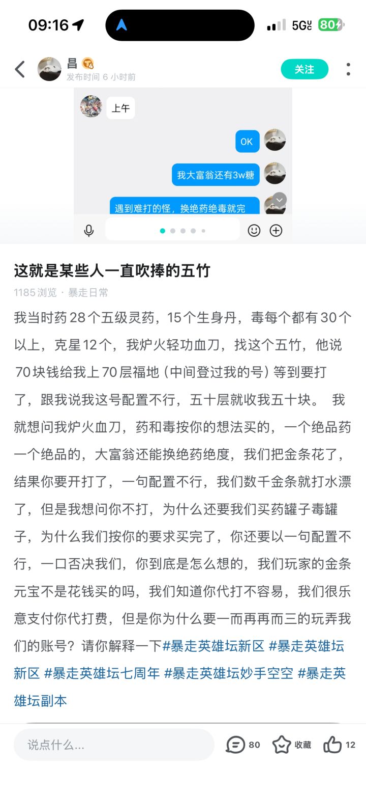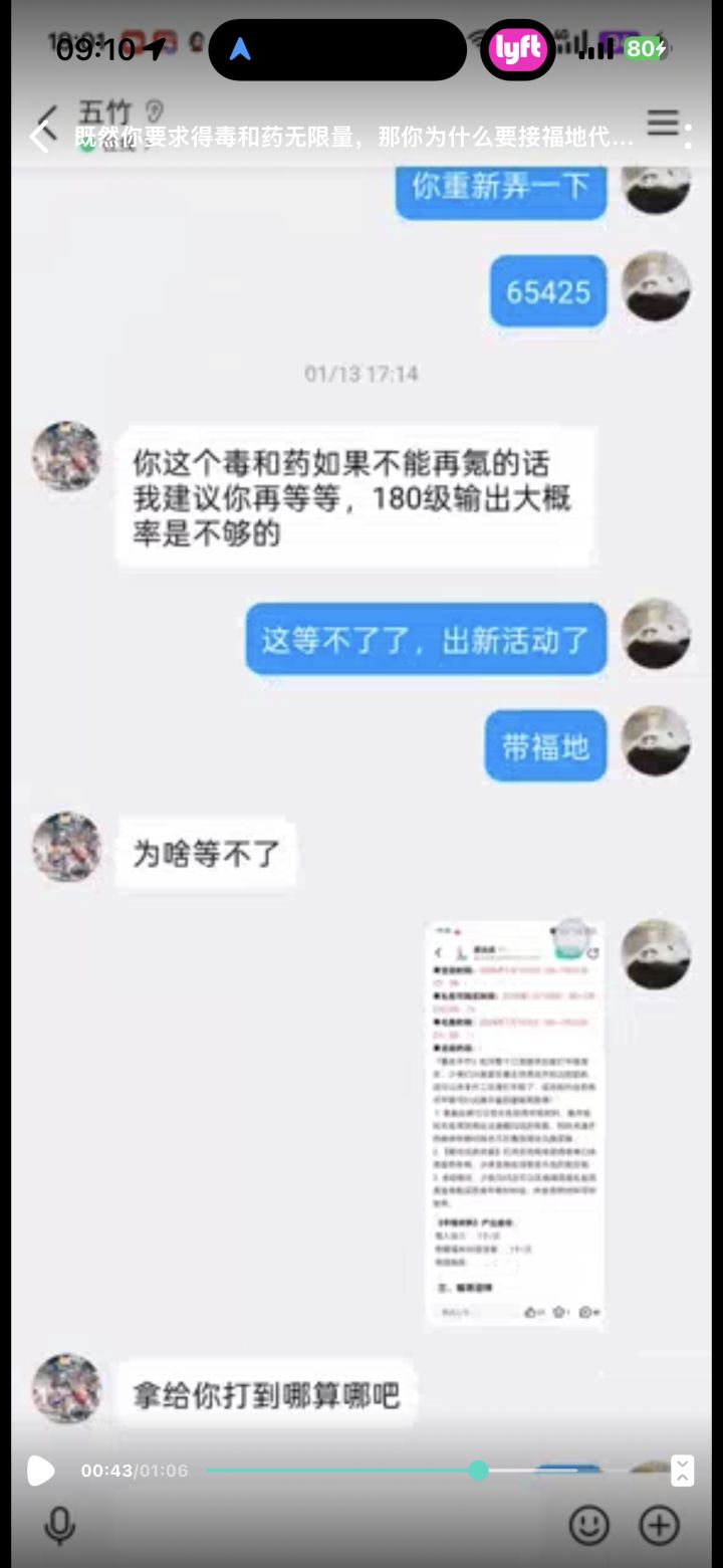 起因是我找五竹佬过福地,一开始说好的是75包过,但是运气不好65层遇到东方了,因没有绝品5级毒和没生命buff竭尽全力无法战胜,故来找我,五竹跟我商量能不能氪一个礼包,我当时心里有点不舒服但是还是氪了,拿里面的绝品毒。最终在五竹佬的精密操作下过了福地。因我是75包过,后来和五竹沟通五竹也是跟我道歉并补偿所有损失。这件事主要还是缺乏沟通导致的,我也有错,在此我向五竹佬道歉,对于给您造成了不良影响,我
