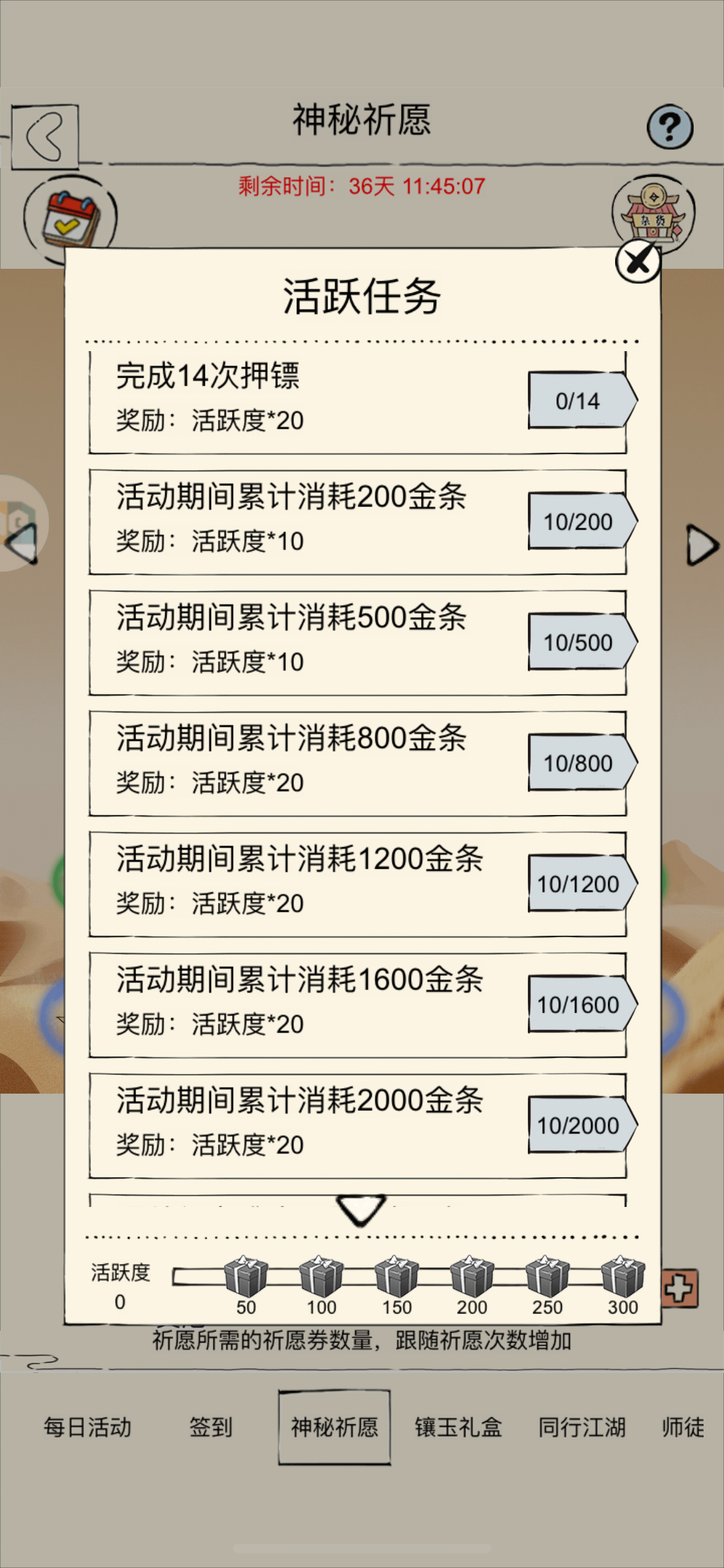 白嫖到最后都吃不满保底吗,我这种开始攒金条的,连衣服都领不到啊太喜欢镖人了,可是想要十字刀,我还心思这么长时间的活动怎么也能白嫖一套吧,一看活跃度做不满,甚至不花金条,你连倒数第二个都领不到,差10活跃度,花费200金正好够,你这个算盘打的真好。只能免费领小七的还有你这个花金条做任务,