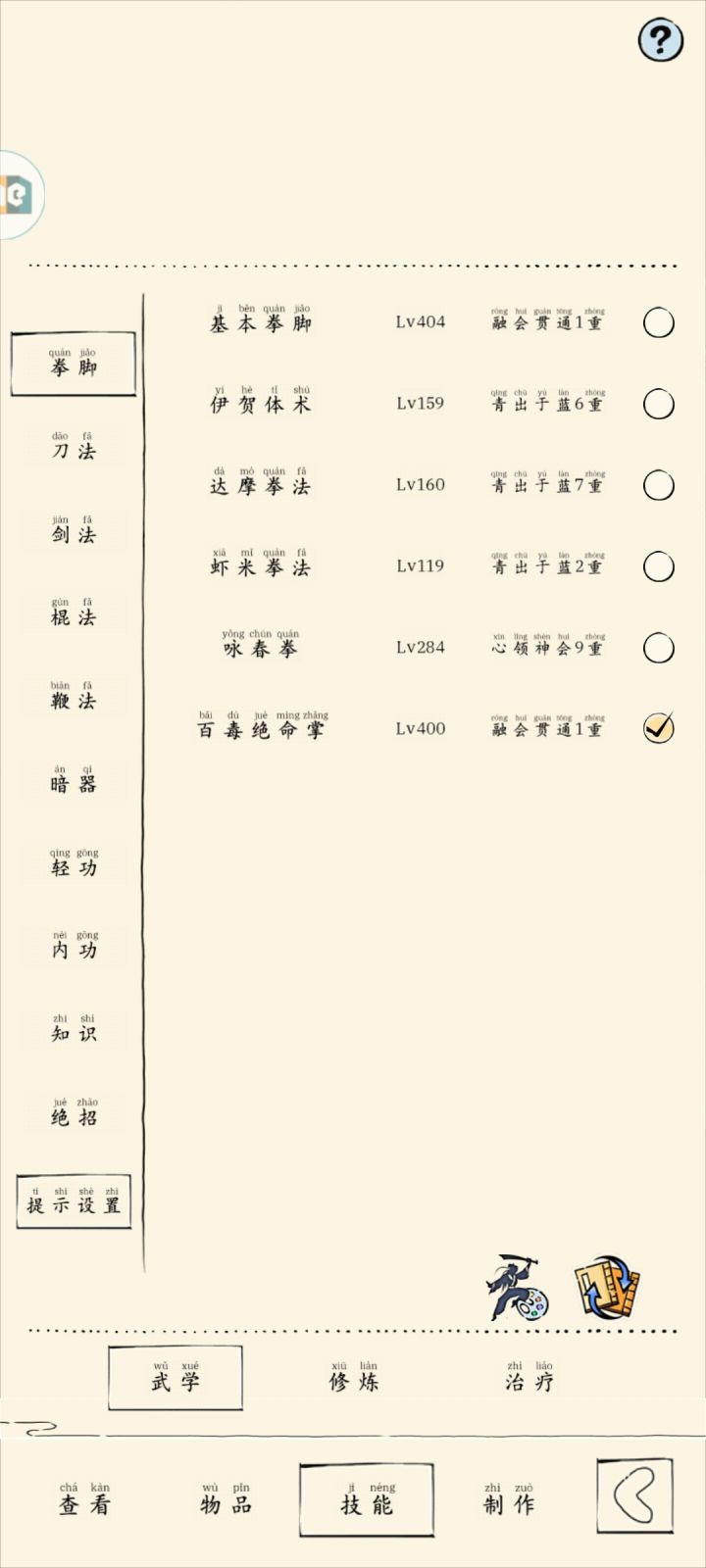 获取方式:福地老乞丐6w金条学习条件:300棍200读书,逍遥游侠●武学特性(被动:战魂:初次进入战斗时获得3层「战魂」,使用对应技能或普攻可以叠加对应层数「战魂」,该状态本身无任何效果;无双:当「战魂」叠加至6层及以上时,清空所有「战魂」层数,获得持续3回合的「无双」效果,处于该状态下时:*免疫缴械,控制。*受到的近战反伤效果降低60%;与「罗汉降魔功」的被动效果加算*造成的伤害