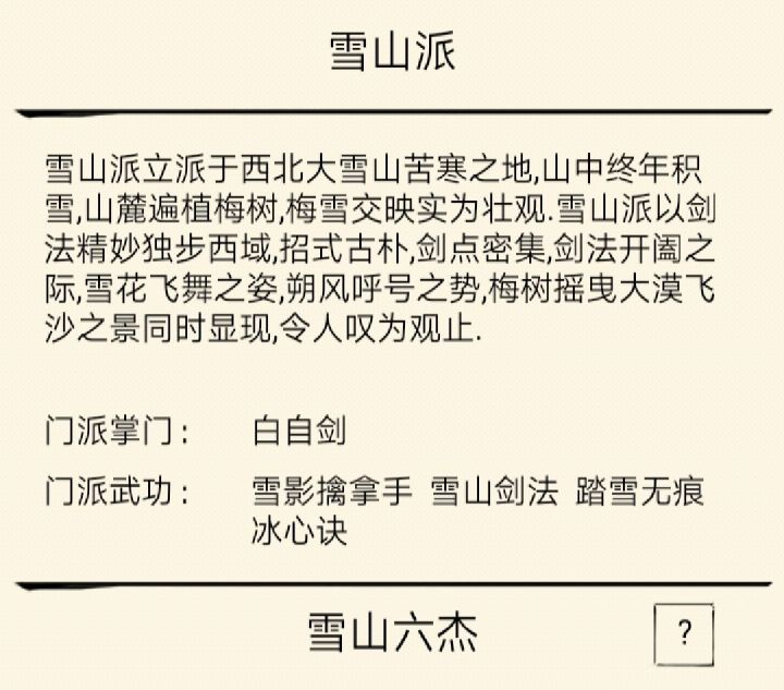 雪山派,原型为金庸先生笔下的《侠客行》中称霸西域的一个武林大派,坐落于游戏大地图的西北部大雪山之上,以雪山剑法为立派之本,招式古朴,剑点密集,在剑法开合之际,有如雪花飞舞之姿,朔风呼号之势,实乃天下剑法之冠!