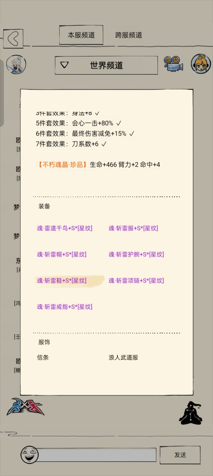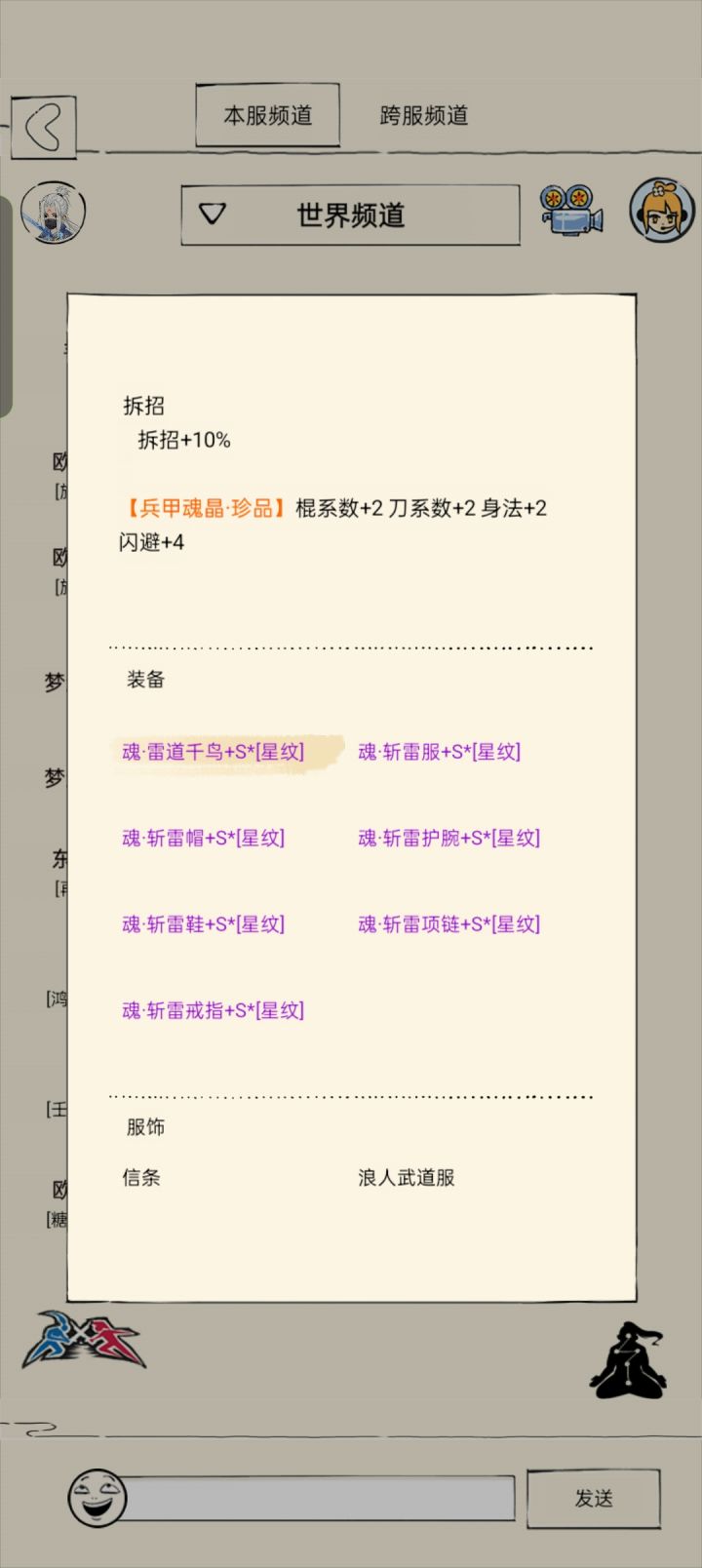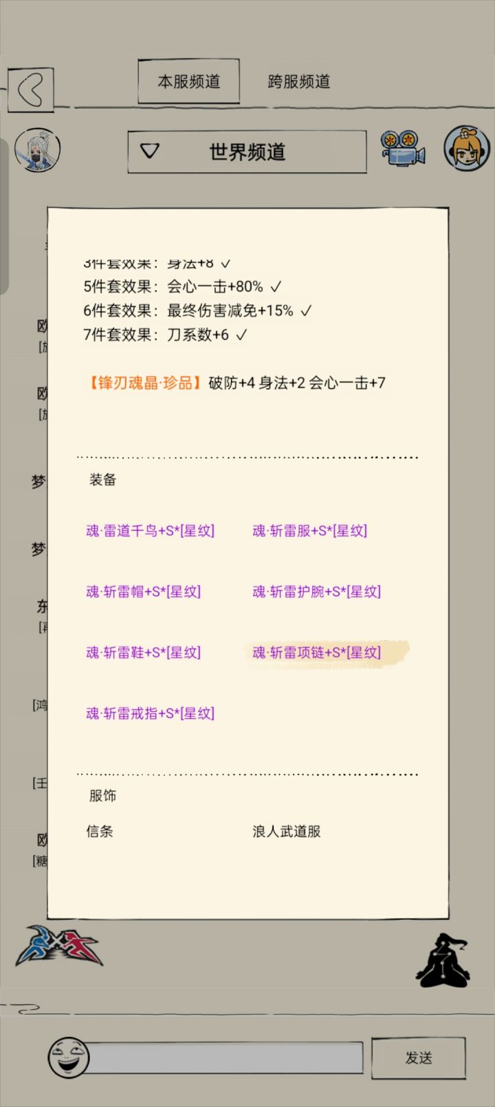 经脉6破8防 3境 悟性210(宝石悟性未极致,极致了也高不了太多意义不大。) 600九四匹配散套齐全:配3气宗+4散件。12%内力(气宗+3件套)+3天人(魔女)+10破防(武者)+20强普(夺命)+5增伤(青龙)整体输出可观终于不在拉裤兜了。黯然输出副本表现差得主要原因是:忘川! 重点:忘川无用!忘川无用!忘川无用!视频里威虎山打了3次用了不同得输出方式。可以看结果。不格挡得话8回合左