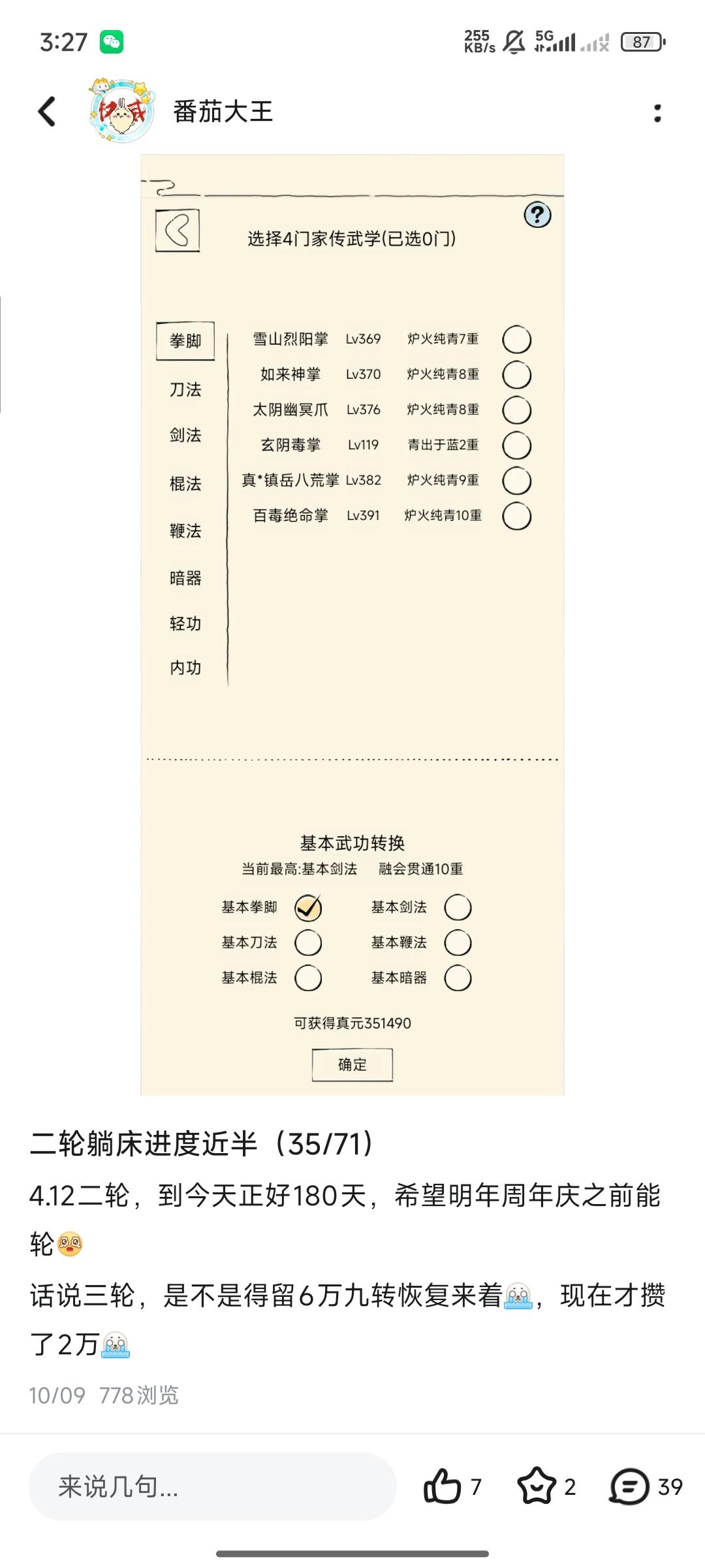 原来不用九转躺的这么慢,从10.9-12.26总共78天,2.6个月,真元涨幅10w,平均每月3.8w71w遥遥无期啊,就算攒够6w九转之后开始花九转,感觉也得到明年周年庆才能轮了