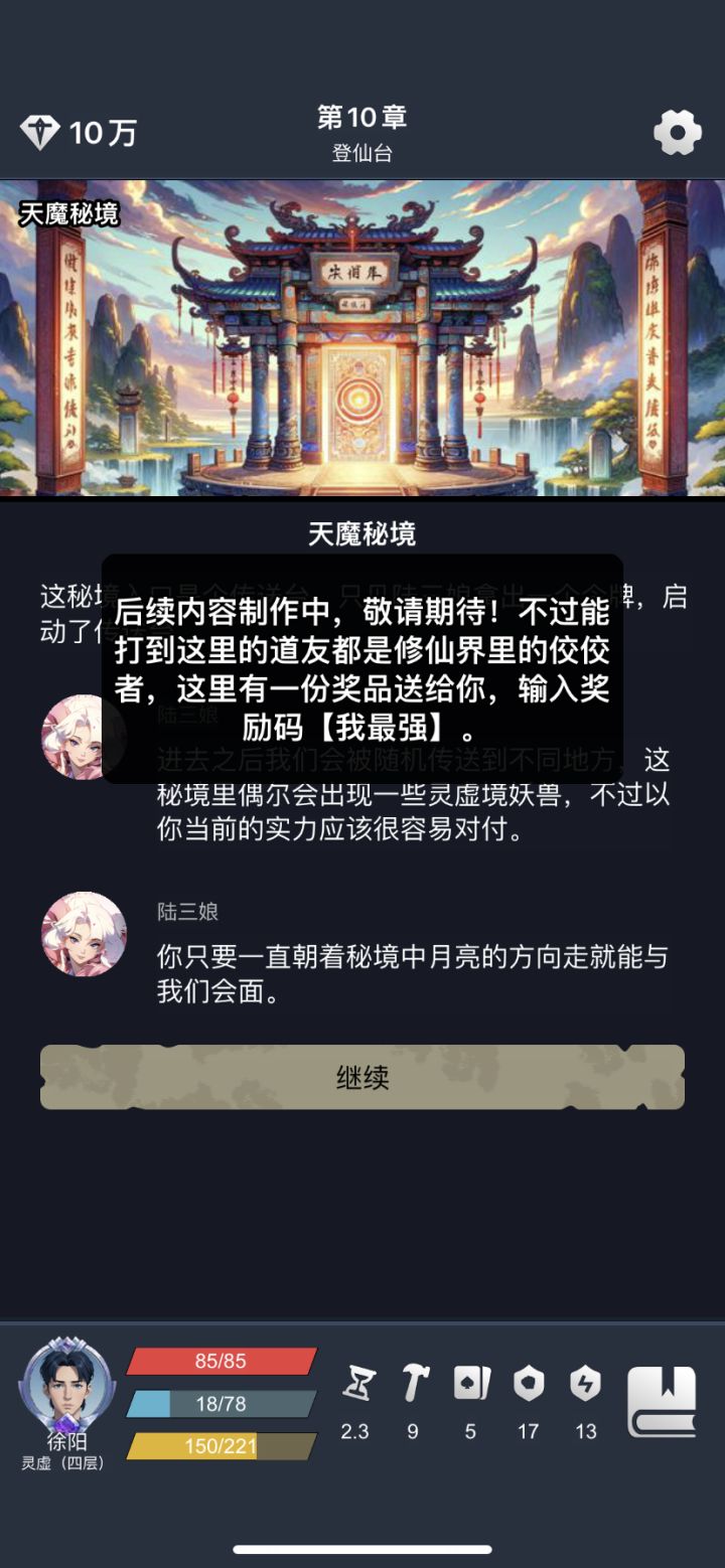 一、礼包码xxp6662024!0VtSqtsjzcHbZVDp3DmFUn9lbymYH70l0+30J6hjgoahH5aRqi0J2Q8pu2KYyLF6+5Xe7OOIGNNa0GwD0RihuA==二、英雄选择新手无脑赵商火法,强度高易上手。其他英雄通关难度略高,尤其是剑仙杨兴。第一局不必急于通关,优先完成成就,领取更多的机缘(成就达成以后,后续每开一局都可以直接去成就里领取一
