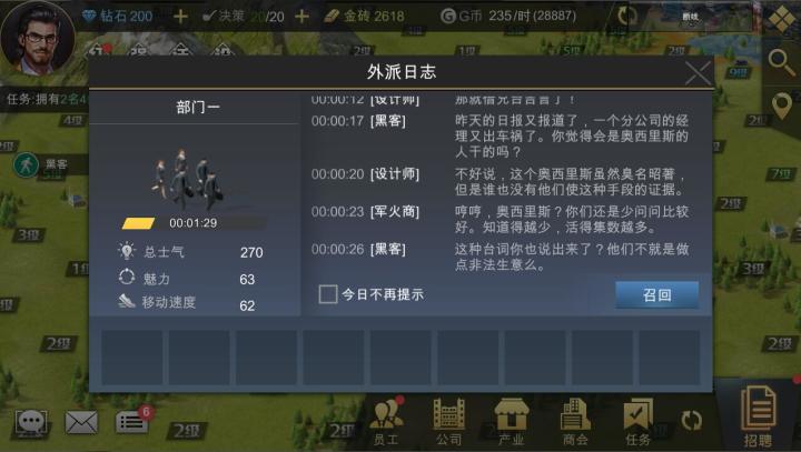 《商业大亨》作为一款商战策略手游,不同于一般SLG游戏简单的占地推图,独创了随机外派事件玩法,让玩家在推图占地的同时,还可以体验随机事件的乐趣。在游戏中,每当玩家进行员工外派相关操作(包括收购、调研、促销等)时,就会触发随机外派事件。玩家可能在这些光怪陆离的事件中获得G币、经验、装备等道具奖励。需要注意的是,随机事件的发生概率以及奖励的获得情况,与部门整体的“魅力值”相关。另外,部门的行动时长