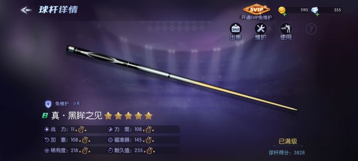 一、球杆。球杆分C、B、A、S、SS、SSS、Z七个等级,一般都需要钻石维护。C级杆里面最好用的是黑眸之见(冠军之路第一关街头台球赠送,初始属性86/86/90,满级后108/108/145),使用金币即可维护,500金币30次,跟初始赠送的紫水晶一个价格,但是属性碾压,对战紫水晶会很有优势。B级杆升级维护的性价比都很低,都不建议用。A级杆比较复杂会单独说。S杆及以上维护费都是一年1000钻及以上了,基本都能用,选择看个人喜好。