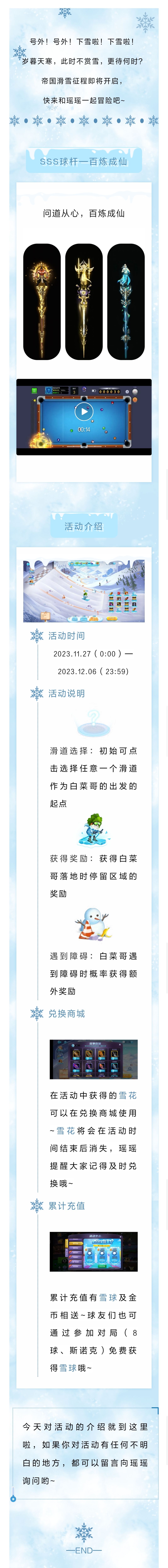 水墨画松清睡眼 云霞仙氅挂吟身 仙鹤穿梭在云间 一帘幽梦氤氲缱绻 山河如画,瑶瑶与你共赏四月天。 云中仙鹤 球杆进洞特效 ●球杆制作过程● 每一根球杆 画师都会反复打磨、精雕细琢 经过不断的改进 最终才能呈现在玩家面前 希望可以得到大家的喜爱~ ●活动时间● 4月2日-4月8日 ●玩法规则● ①花费宝石购买玉叶,并使用玉叶进行抽奖; ②免费玉叶:活动期间,进行充值和对局都可获得免费的玉叶噢; ③