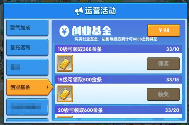 感谢CEO:风花雪月 的投稿!风花雪月友情提示理性氪金,适度游戏,护肝,护肝!!以下内容分为几大类:氪金、市场、段位、游戏品质等等。氪金:98创业基金:据官方介绍50级能有8888金条。点评:若氪金,必氪!每日优惠礼包6元:100金+2汉堡点评:配合开服七天活动,必氪!金条特权30元:300金+30x100金(每天100)点评:月卡,收益可观,一天一元,可氪!开发特权25元:2