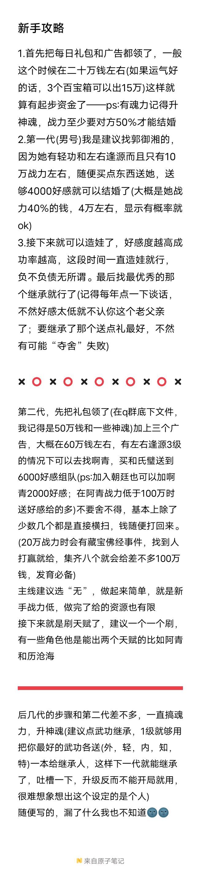 玩了一段时间了,看这里攻略基本都齐全了,不过新版敌人生死战可以升阶又让我想到了偷袭流养队友。所以简单的分享一下关于偷袭方面的,其他攻略论坛已经齐全! 偷袭流的好处: 可以省钱又能快速培养队友,正常情况下亲密关系的好友战力100万以下每回合只能提升6000好感,100万以上只能提升2000好感,这样来算培养一个队友需要的时间太久了,在有限的游戏寿命里,偷袭流可以快速让队友升阶! 偷袭流的弊端: 由于是生死战,弊端嘛当然就是被ko直接game over 了,高战力还可能被偷袭致死,一般情况下战力高的仇人偷袭就可能一刀毙命,当然这种情况仅限于高战力,如仇人战力5亿,自己1000万战力,由于游戏血量上限只有10亿这种偷袭致死的情况不玩偷袭流正常玩大后期约战也可能出现,所以后期约战时与战斗时和当地所有人对话一般不会出现仇人 偷袭流准备条件: 4级以上天赋左右逢源,特殊技能葵花点穴手,角色缘分2+2+1或3+2,并不是五人组不能玩,而是这样更容易培养队友,有经济实力养2个放 个在外偷袭养,没有就养4个放一1个在外,需要注意的是拜师条件是大于目标10%战力,还有自身经济实力,防止战力太高收不回来或者收回来用不了。 偷袭流大致玩法: 如果没有葵花点穴手,商店可以买暗器,[图片] 有钱买金蛇锥没钱毒龙锥,氪了暗器套自带葵花点穴手就不用管了,之后找到你要放养的缘分角色交互界面选择偷袭,无论成功与否都会掉大量好感,葵花点穴手掉好感最多相对来说偷袭就很稳定[图片] 偷袭注意好感方面以及对方实力,大概好感-500到-1800几率偷袭我们,高战力偷袭是会直接病入膏肓游戏结束的,-1000以下会成为仇人,之后年年可以在仇人列表偷袭他,好感-1800以下很高几率会生死战,如果在没有葵花点穴手的情况下生死战约了我们先不要决战,继续生死战界面点决战然后偷袭到-1000左右下一年再去战斗他才会更大几率升阶,有葵花点穴手则可以同年先偷袭后战斗让他直接升阶,如此循环很快就养起来了。葵花点穴手需要20%内力,注意自身内力值,否则是用不了的。还需要注意的是跨级别作战一定要选好阵容去打,天山折梅手封技能,金刚般若掌真伤,降龙十八掌眩晕,配合去群殴,需要注意一点,生死战尽量手动,不要等最后一年到了系统自动打,否则他比你高好感又低就会直接被杀游戏结束 关于收回缘分角色: 一般养到战力高于自己十倍以内且有足够资金提升好感和拜师就可以收回来了,或者感觉他再升阶自身实力群殴也打不过的时候就赶紧送礼提升好感再打。之后提升好感拜师战力够了再结义,好感这里可以选择养有门派的角色养好再加入他的门派可以增加2000好感,之后再送3500好感就可以拜师了。氪金党可以直接吃缘分酒席,拜师用拜师茶。脸白的零氪党如果遇到选择事件得到拜师茶也可以。宠物方面如果想要哪个宠物就找他主人提前搞好关系满境界年年对话,或者就年年去约战宠物所在地的人等它跟你成仇人偷袭让它生死战再生死战约你的时候每年送礼,生死战完它就是你的小跟班了,当然理论上也可以像缘分角色一样养它再收回来培养,我还没试过,理论是可以的。 最后补一下左右逢源天赋和葵花点穴手的图,图鉴里可以查找到,男角色找李莫愁郭襄生孩子,女角色找段誉,后代继承天赋,葵花点穴手灭日月神教或者氪暗器套或无尽7-8层还是6-8层掉落。葵花点穴手是可以不用学习去偷袭的,打架带个两仪剑阵,真武七截阵,斗转星移都是可以的,怕突然武功境界把点穴手消耗的话可以锁住[图片] 基本就这样了,论坛攻略很全,群里大佬也很多,其他方面的问题都基本可以找到答案 来自TapTap[ID:62807985 春花秋月何时了]