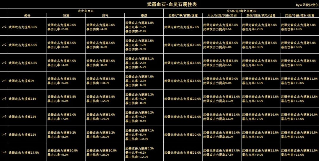 来自玩家:五十度灰兔 【武器圣痕血石系统】 武器圣痕系统包括圣痕重铸和血石镶嵌。 <圣痕重铸> 玩家可以到铁匠尼尔森处对70级以上武器进行圣痕重铸,消耗一定量的银币、灾雷之眼和对应的元素结晶。 1、物理暴击武器的圣痕重铸效果是最大提升7.5%武器攻击力和4%的暴击几率。 2、物理纯攻、负暴和暴击暴伤武器的圣痕重铸效果是最大提升7.5%武器攻击力和8%的暴击伤害。 3、元素暴击武器的圣痕重铸效果是最