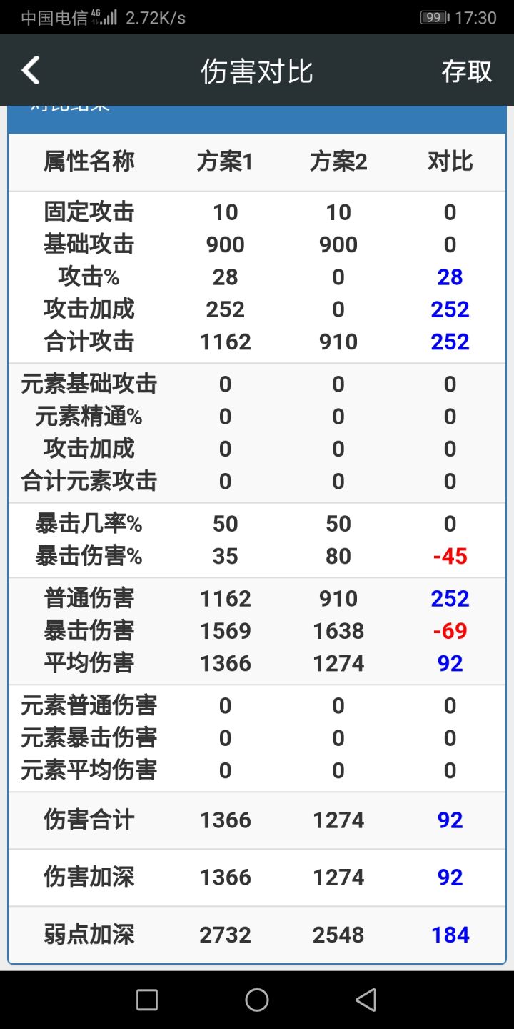 我们来看看物理40强攻和40重创的收益对比,物理武器满级满精铸的暴击大概在50左右