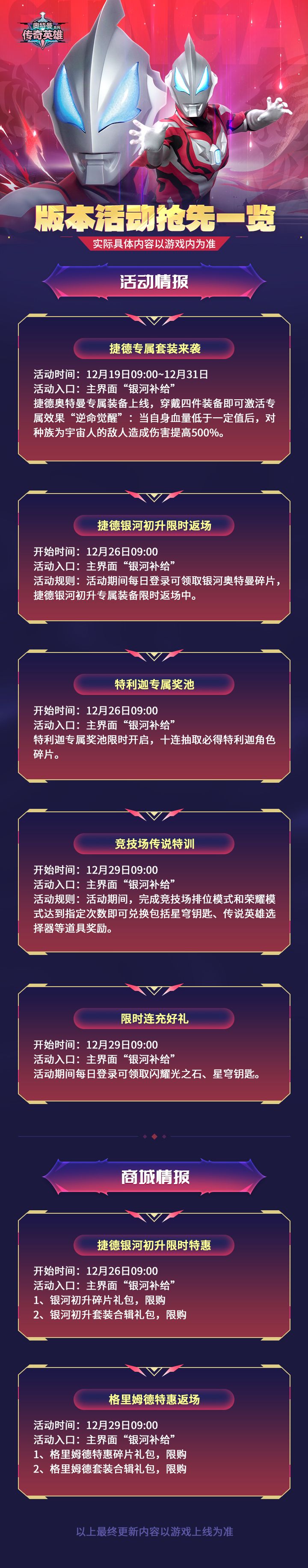 各位小伙伴们,《奥特曼传奇英雄》将于9月5日更新,全新版本“光之勇者归来”上线,泰迦奥特曼全新专属装备登场,光之国无尽宝藏活动开启,托雷基亚限时概率提升,多重福利快来随奥特君一起看看吧!