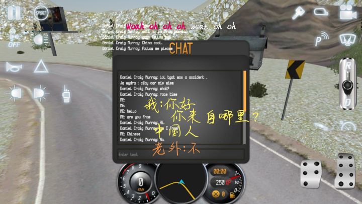 开局一个人正玩呢进来俩人,开的奔驰c,一直跟在屁股后头,可能是因为我开的小牛吧😂,我就纳闷了就问他们是不是中国人,然后他们说自己分别是加拿大和美国人,还夸中国人,哎哟卧槽厉害了,看来我常年不及格的英语没白学😂😂