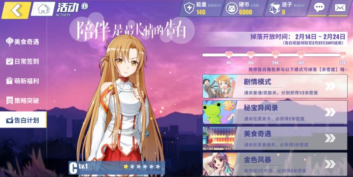 夜幕降临,华灯初上。今晚的月色是否会比曾经更美?在这特别的时刻,开启你和TA的专属告白吧~☆Pick up!告白计划☆活动期间可以选择任意一名非限定角色参与告白计划吧!参与特定玩法还会获得亲密度奖励哦!*告白计划会自动选取零境使拥有的等级最高可养成角色;等级相同时优先选取品质更高的角色哦!零境使们会选择谁呢~说给咲久听听吧!