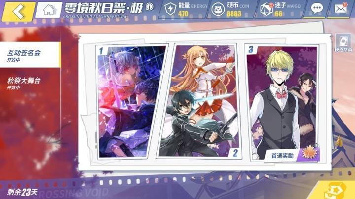 夜色渐浓,华灯初上,零境世界即将开启盛大秋日祭典啦!不过,秋日祭上的各个区域似乎都出现了奇怪的骚动,零境使们快去一探究竟吧!◆活动时间:9月21日开服后-10月18日◆活动说明:零境秋日祭共分为三个章节:「作品展示区」、「商品售卖区」和「特殊活动区」。每个章节分为5个主线关卡+1个奖励关卡,最低可消耗6点能量(特别关卡除外)挑战关卡,可启用超能模式。挑战成功将掉落“枫叶币”,使用“枫叶币