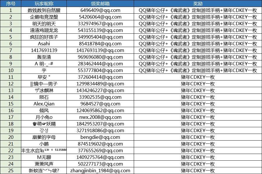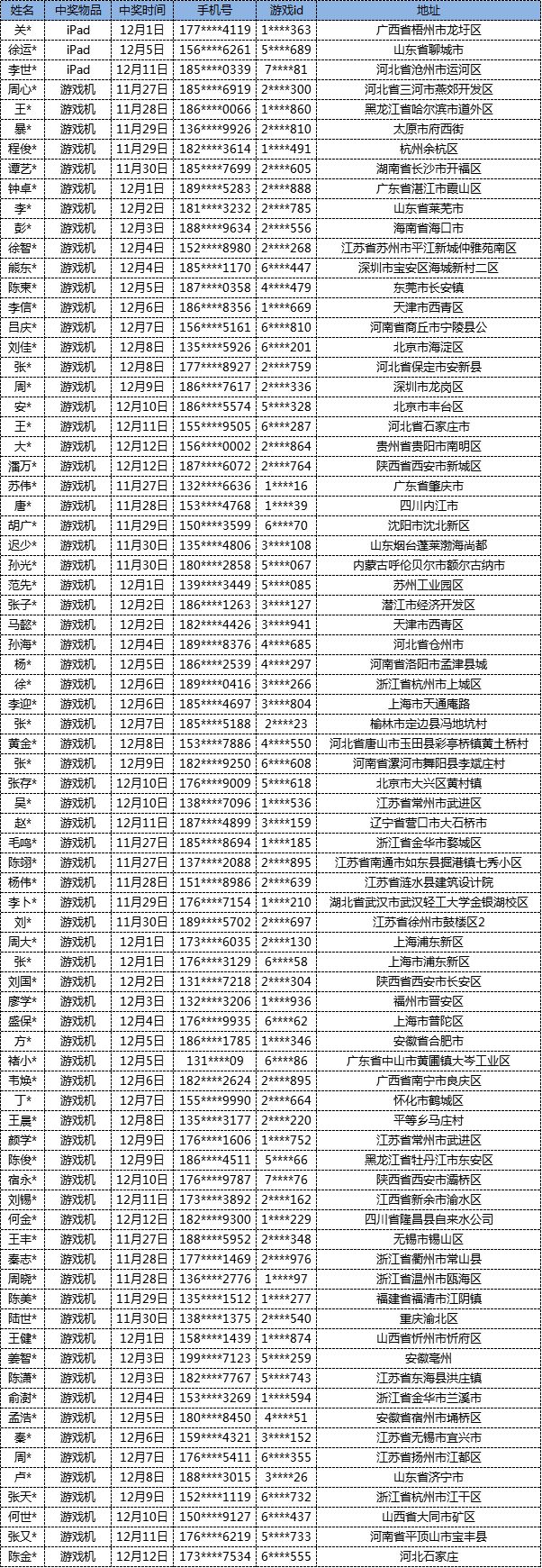 《魂武者》手游在11月27日~12月12日期间、在游戏内上架了“全民决斗”转盘抽奖活动,期间共有78名玩家抽得实体奖励:3名玩家抽中ipad mini 4大奖,75名玩家抽中掌上游戏机。各位玩家所获奖品已于12月14日全部寄出,预计需1-2周邮寄时间,请中奖的玩家稍作等待。另外,有1位马姓玩家未提供详细收件地址,也未接听官方来电、未回复官方短信,视为放弃奖励。 现将中奖玩家的部分信息进行公示如下: