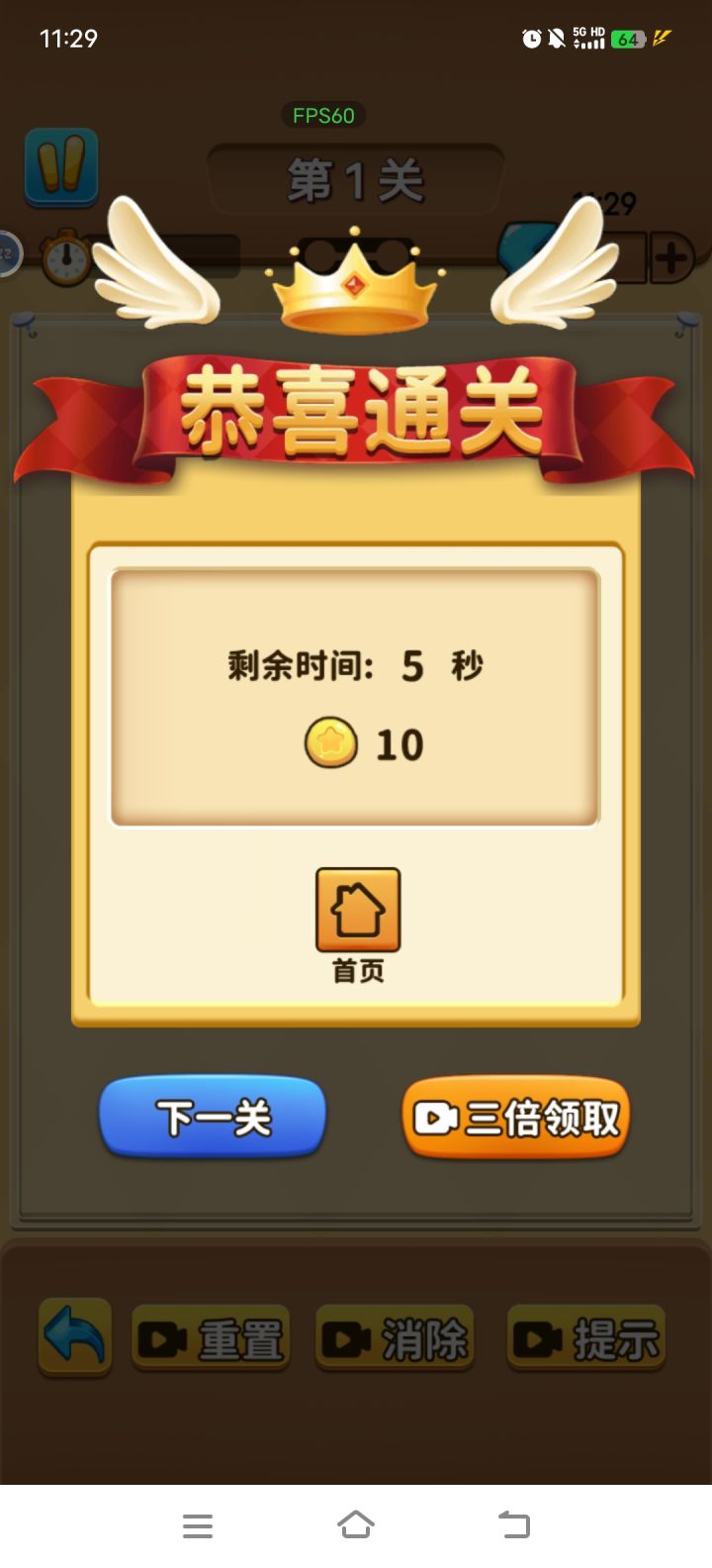 时间限制比较短,炸弹爆炸时间也很短,设计不合理,看广告加60s,过一局给10金币,解锁下一关要15金币。一句话总结,广告追着玩家杀。一星给画面,一星给音乐。