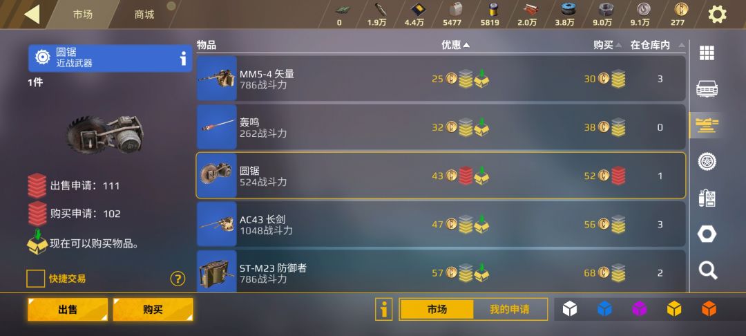 今天就拿圆锯说明市场价格 首先我们看购买,当前购买是52金币,可以看到想用52金币购买圆锯的数量是三把。51金币购买的数量是一把,50金币购买的数量是4把,可以看到购买申请102,说明还有很多想用低于50金币或者高于52金币购买的数量。如果你想快速购买到东西就默认价格52购买。 再来看出售 看当前价格43,44金币出售的有5把,45金币出售的有13把,46金币的是9把。出售申请111,高于46或者