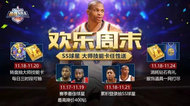 时值隆冬,枯叶凋零 这个寒冬会让人很享受 因为可以窝在暖暖的被窝里 拿起手机约战《最强NBA》 为了感谢小伙伴们对我们游戏的热爱 小师妹给大家准备了一波重磅的福利 自游戏双十一活动结束后 《最强NBA》要为这个冬天再增添色彩 新的一波活动再度来袭 come on!随着小师妹提前了解一波 1 周末狂欢,大奖送不停 赛季最佳球星限时折扣 活动时间: 11月17日-11月19日 活动内容: 赛季最佳球星