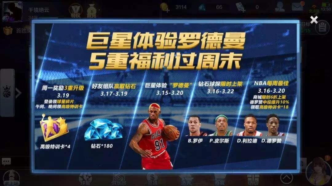 又到了每周爆料活动的时间了 小伙伴们期待本周的活动么? 这周的体验巨星是谁呢? 快来和小师妹一起看一看吧! 主题一:巨星体验周—罗德曼 一、【顶级球星体验】罗德曼 活动时间:3月15日—3月20日 活动内容: 累计登陆1天 金币*100 累计登陆2天 金币*166,高级特训卡*1 累计登陆3天 金币*166,高级特训卡*1,罗德曼3天体验卡 累计登陆4天 大师技能书*1 二、【罗德曼】篮下霸主 活