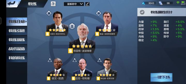[微氪玩家的教练组以及中锋推荐]教练组推荐:一,首先第一套篮板防守教练,适合所有内线球星[所有中锋,大前锋,以及所有扣将]超高的篮板加成可以使你抢篮板时得心应手,其中内线,力量,灌篮,盖帽加成可以使你在灌篮,拉杆上篮,以及内线站扣,脚步时时拥有更高的进球率,不容易被盖,在你防守时更容易将对面盖下来。二,其次是第二套稳定中投防守型,适合所有的顶投,以及防守型烟味[例如佩顿,小卡,斯托克顿或者