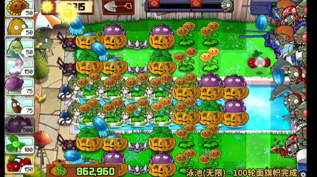 小丑?炸!舞王?炸!海豚?炸!巨人?炸!冰车?炸!橄榄?炸!矿工?炸! 其实是瞎改的八炮阵,但不用看玉米加农cd,容错率高,可以炸的比八炮更频繁,反正有阳光就能炸,炸歪了就再炸一遍,地下的矿工都炸。 地刺王是因为懒得搞搭梯,又想少补南瓜,就放在了大部分小鬼的落点。 这轮没带南瓜,但问题不大。 大不了全炸了,就不用补南瓜了