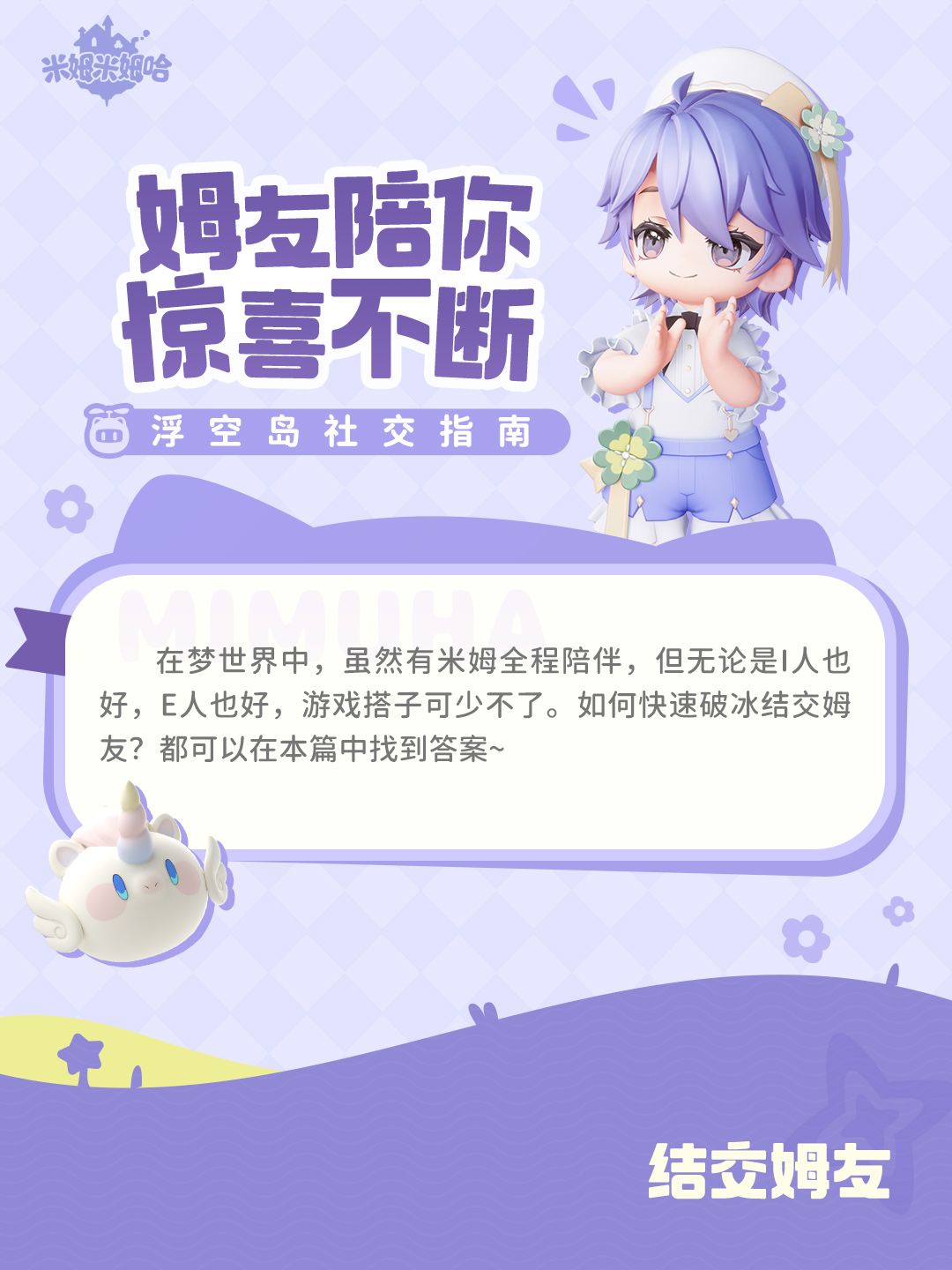 担心登岛后孤单寂寞冷?不存在的!M宝社交破冰指南来啦~ 种田经营、蹦迪搞怪,姆友陪你,惊喜加倍! == 联系我们 == 想了解更多游戏资讯或联系官方,欢迎通过以下方式联系我们! 官方网站:@米姆米姆哈 小红书:@米姆米姆哈 微博:@米姆米姆哈 官方公众号:搜索【米姆米姆哈】