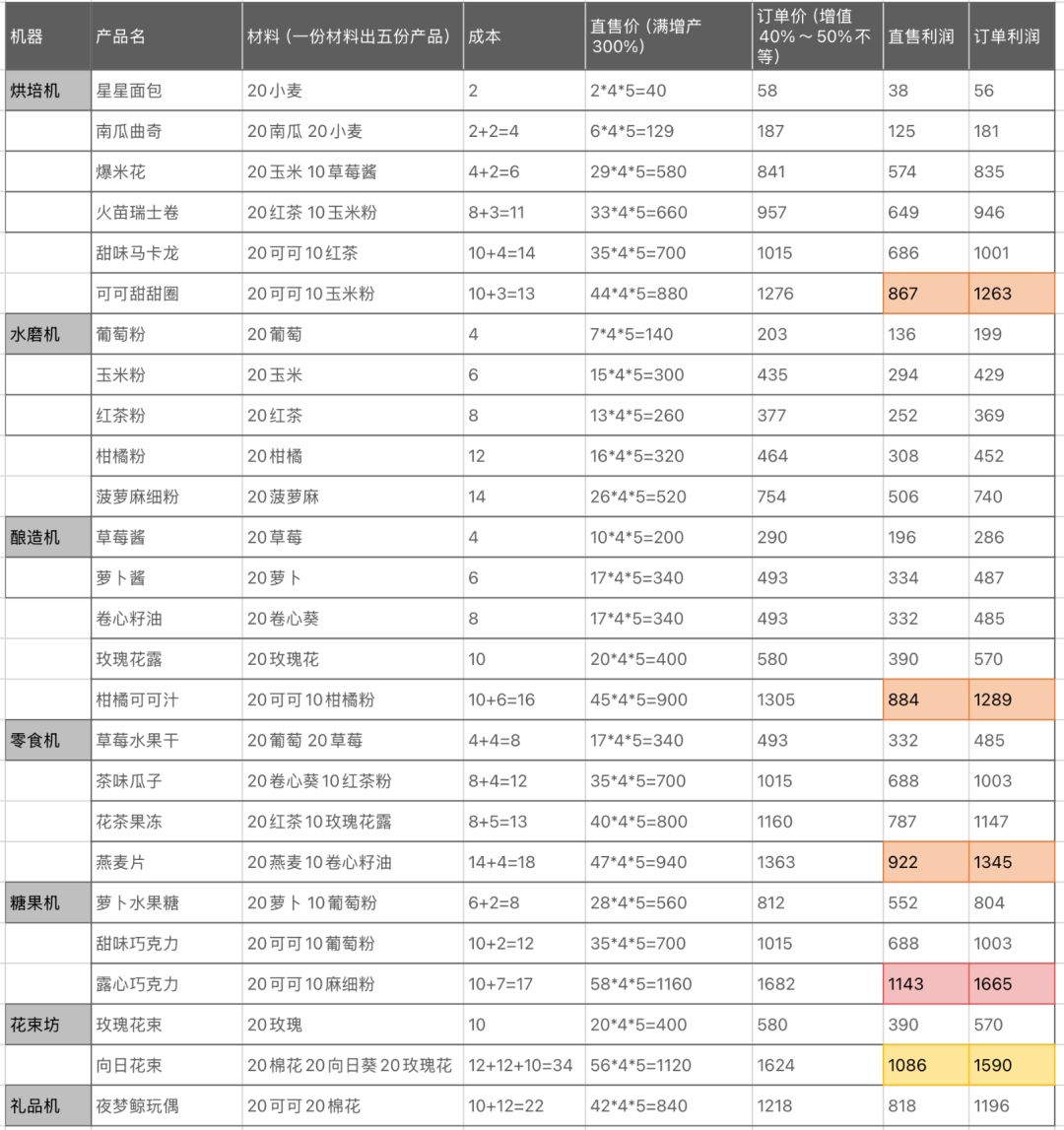 ---表格仅供纯金币利润赚钱参考,会随等级更新--- (40级版) 首先是结论----- *表格适合上线时间不算特——别多的宝,选做纯利润最高的产品 *只在三到五台机子里最赚钱的做,节省糖果最大化收益 *订单利润高出很多,但是仅刷出稿利润产品出售比较麻烦,所以有空就刷点高价订单,用订单不出去的直接直售清仓 *米姆工作需要糖果,木头石头和仓库在够用的情况下可以停产不需要囤那么多,浇水有空也可以手动浇